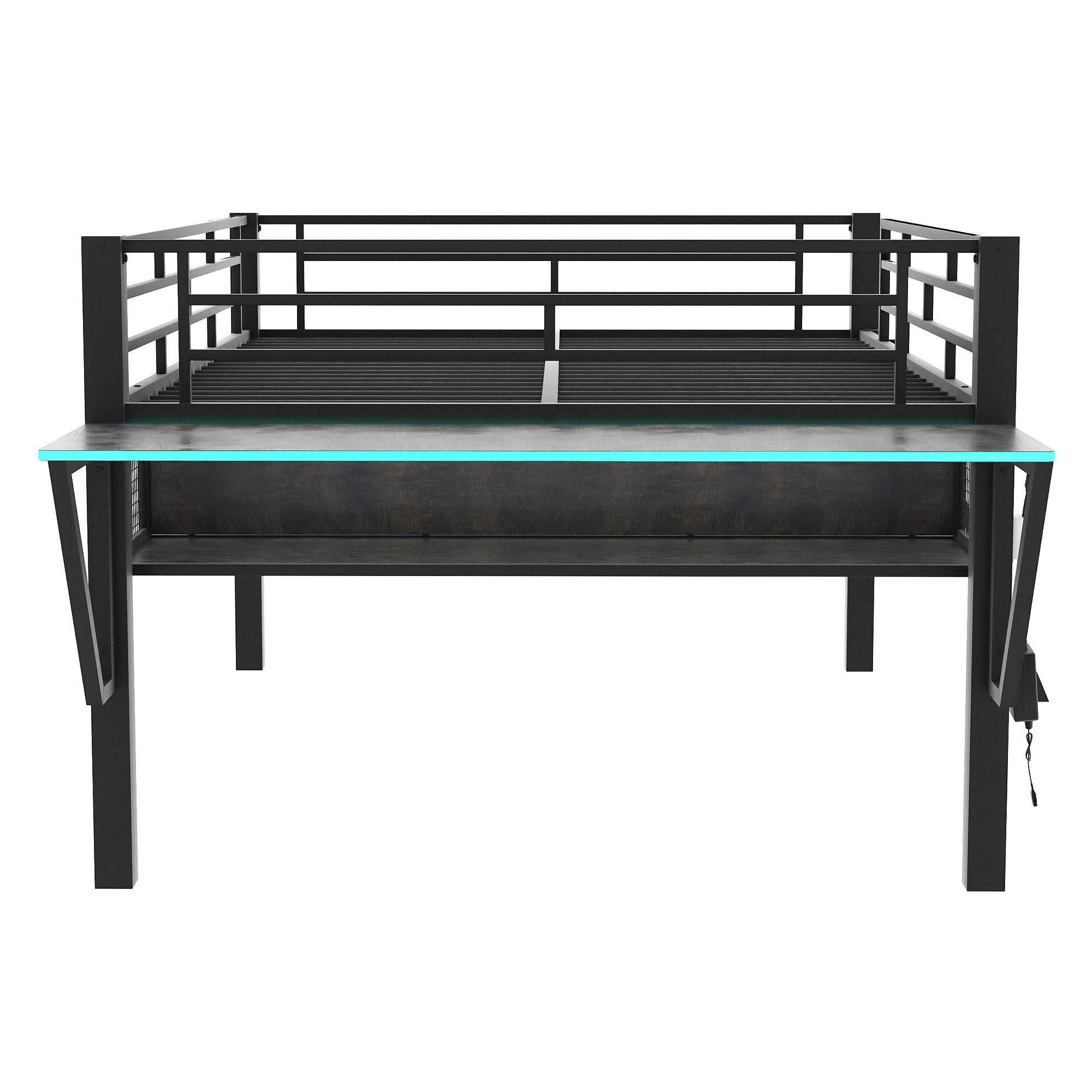 Create the ultimate gaming hub with this mid-loft bed designed to maximize space, organization, and style. Built on a sturdy steel frame with integrated desk and vented mesh storage, it keeps consoles, peripherals, and PC hardware neatly stashed while providing a dedicated TV/monitor platform and work area. Sleek black finish and LED lighting enhance the immersive gaming atmosphere, making it an ideal choice for teens and gamers seeking a compact, functional setup.