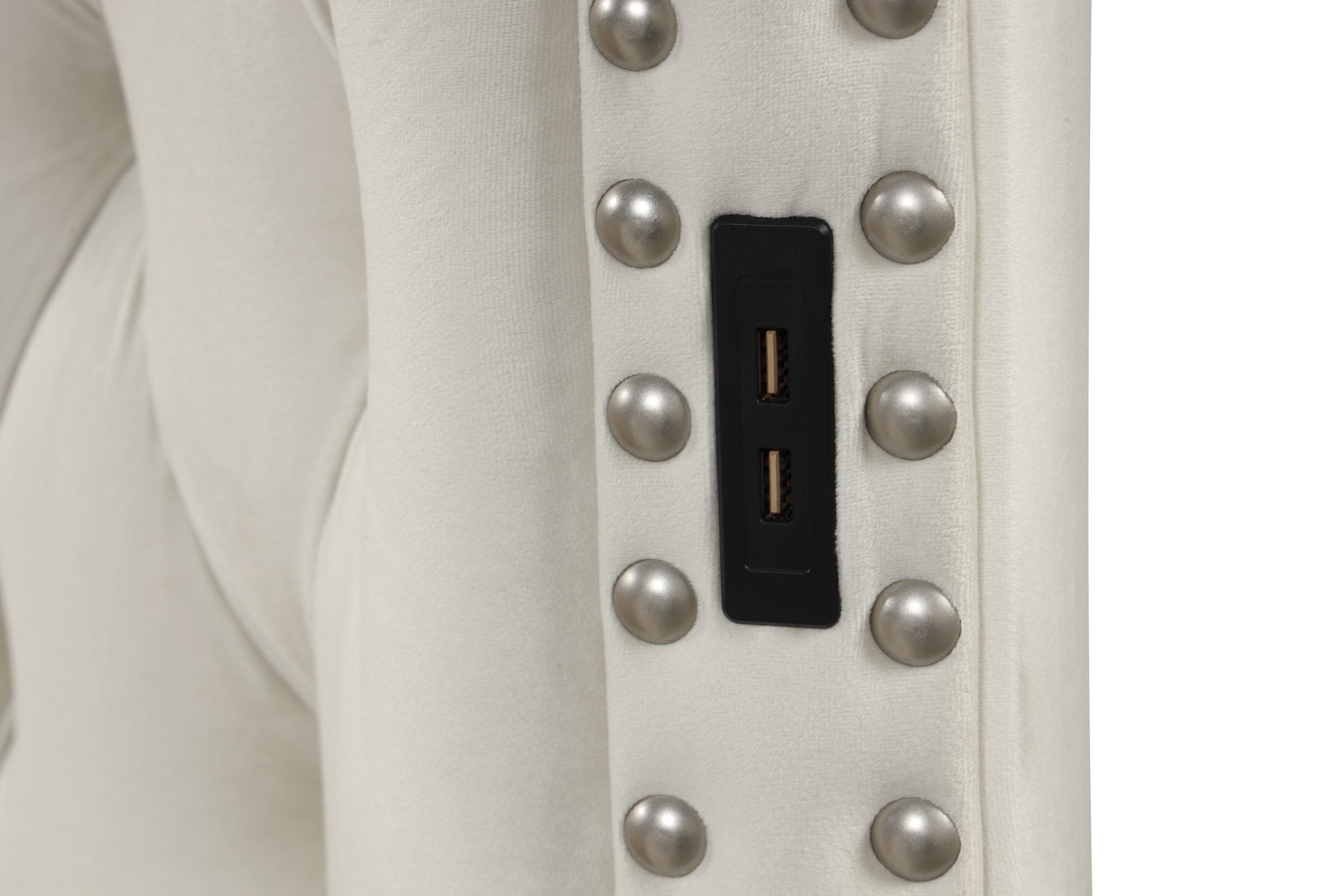 Bring modern glamour to your bedroom with the Hazel Queen Bed — a stylish, contemporary piece that pairs plush comfort with practical features. Upholstered in soft velvet and accented with nailhead trim, this queen-size bed offers an inviting focal point and clever conveniences like built-in storage and USB charging to keep your space both beautiful and functional.