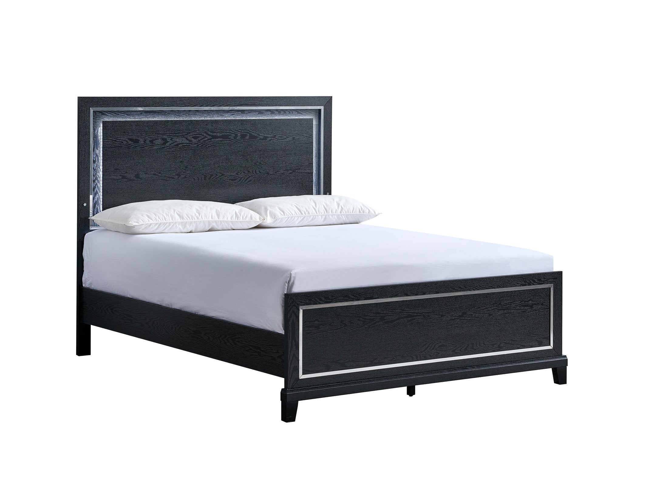 - Make a bold impression with this contemporary queen bed, featuring a striking black finish and a headboard illuminated from behind.