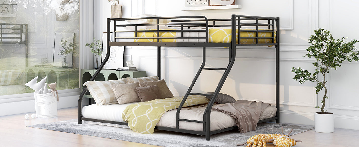 Bring contemporary style and smart space-saving design to your bedroom with this metal floor bunk bed, configured Twin XL over Queen in a sleek black finish. Built with a sturdy steel frame and an inclined ladder for comfortable access, it’s ideal for shared rooms, guest spaces, or families seeking a functional, modern solution that maximizes floor space while maintaining safety and comfort.