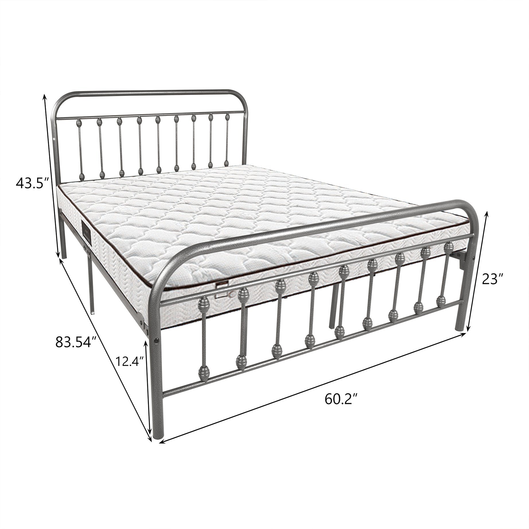 Experience the perfect blend of vintage charm and modern functionality with this queen-size metal platform bed. Designed to eliminate the need for a box spring, its sturdy steel slat system delivers quiet, stable support for up to 450 lbs while the Victorian-inspired headboard and footboard add timeless style to any bedroom. Flat-packed for convenient delivery, the bed is straightforward to assemble with all tools included and anti-slip accessories to keep your mattress firmly in place.