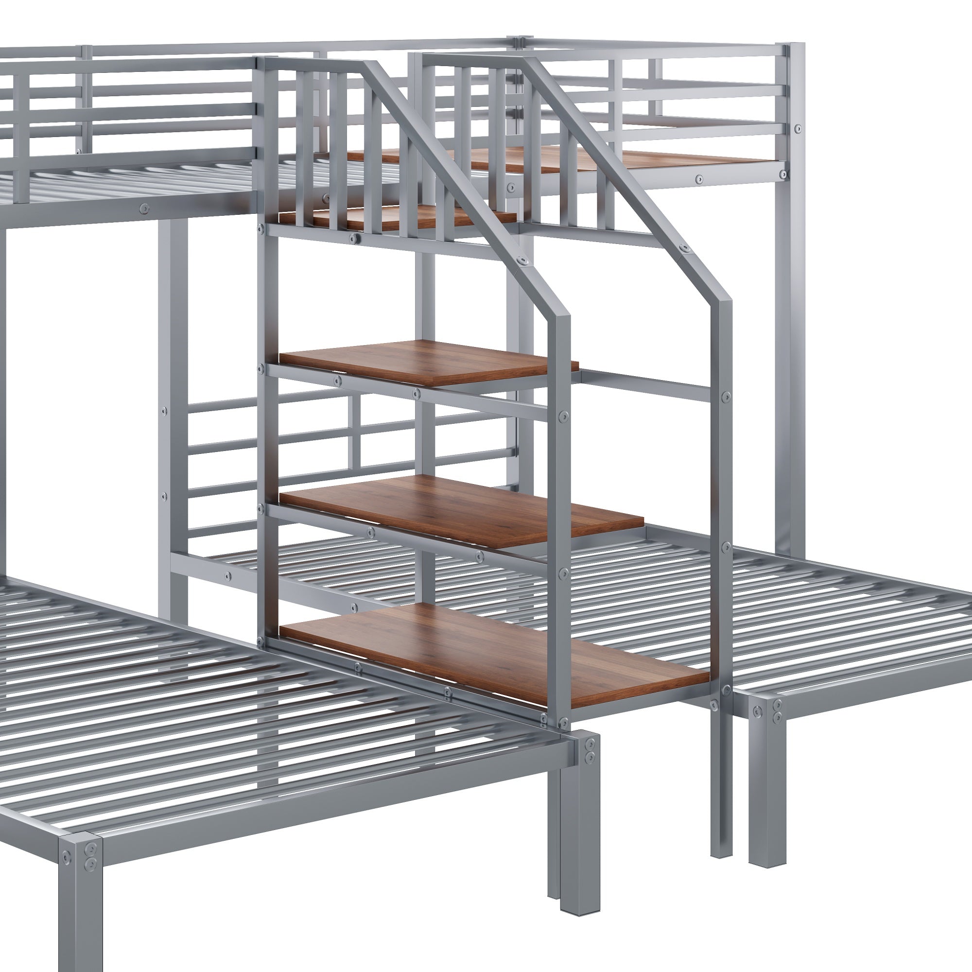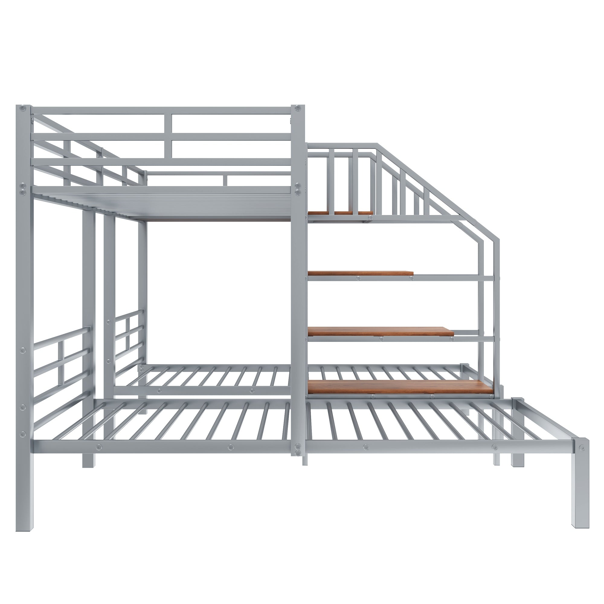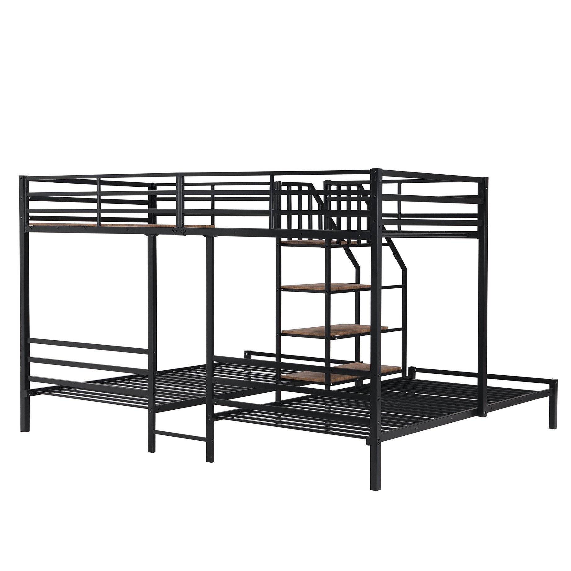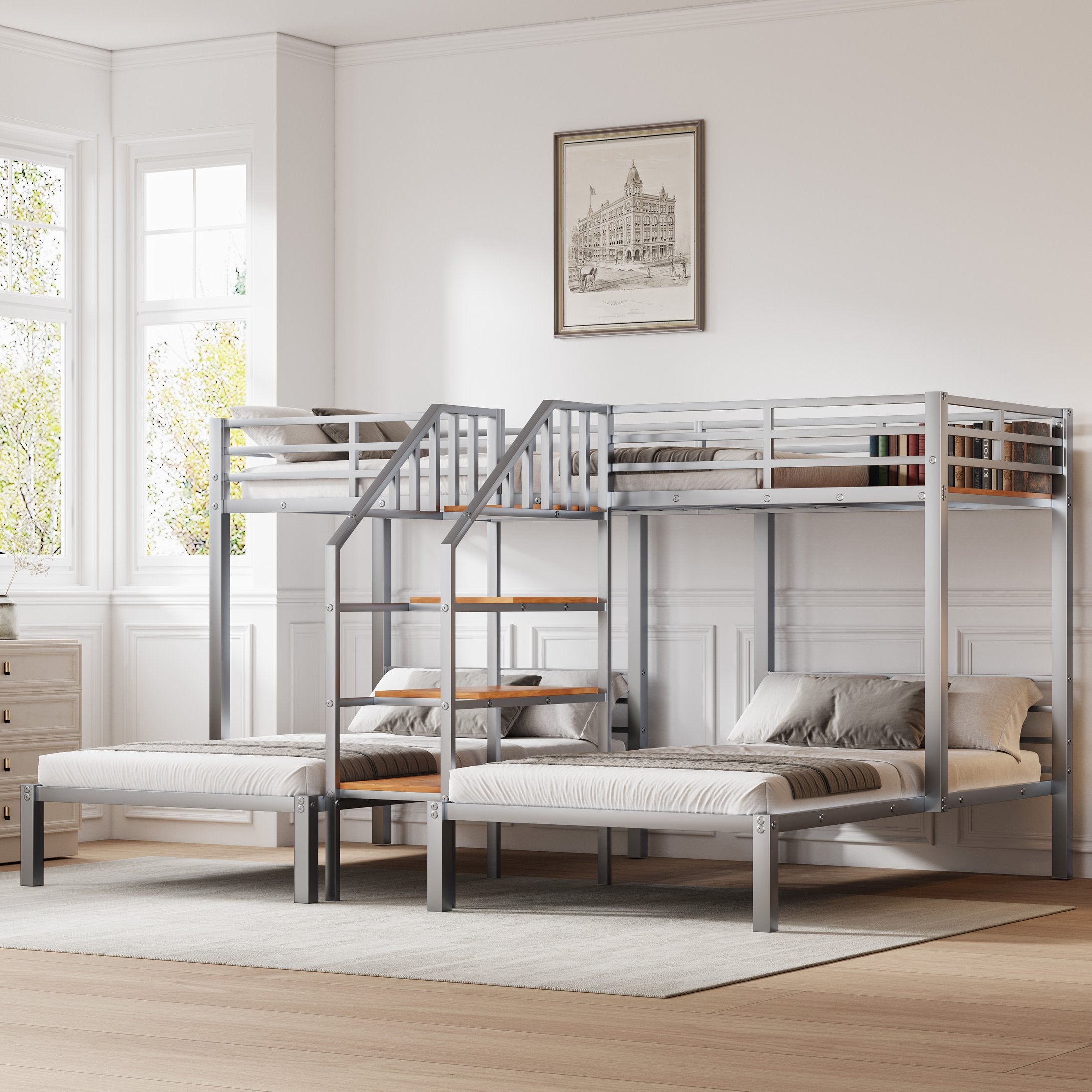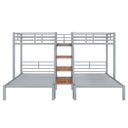 This sturdy metal triple bunk bed combines smart space-saving design with practical storage so families or group homes can comfortably sleep three using a compact footprint. Featuring a twin bunk over twin plus an additional twin beneath, it offers secure sleeping with full-length top guardrails and a staircase that doubles as accessible storage shelves. Durable construction and thoughtful details make it ideal for kids' rooms, guest spaces, or shared bedrooms.