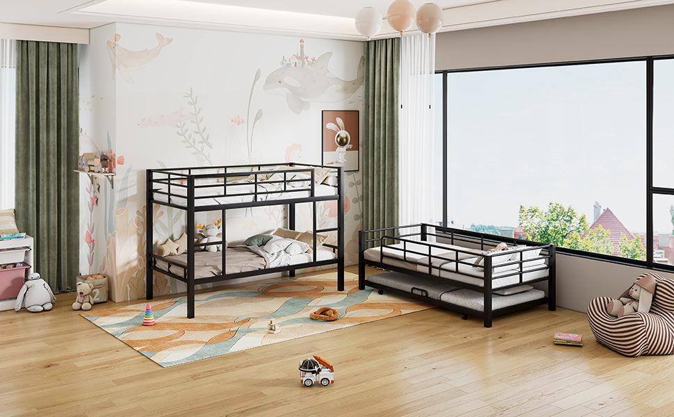 This sturdy white metal triple bunk bed with trundle is an ideal space-saving solution for growing families, guest rooms, or shared bedrooms. Built from heavy-duty steel with integrated guardrails and two ladders, it offers secure, convenient access to the top and middle bunks while maximizing sleeping capacity in a compact footprint. The included trundle adds flexibility for guests or sleepovers without sacrificing floor space.