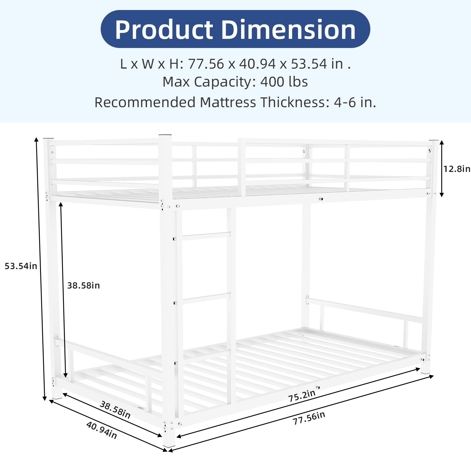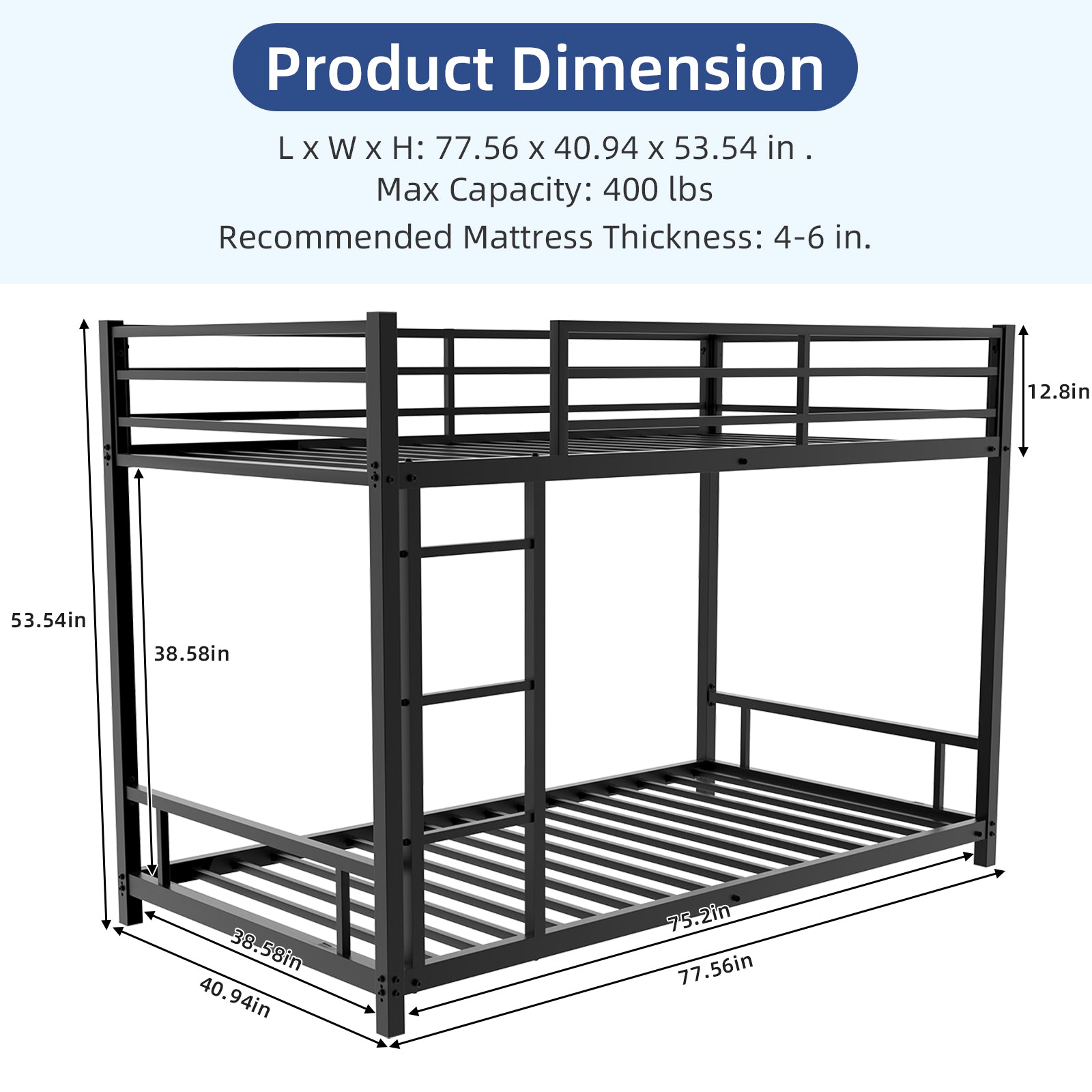 - SAFE AND SECURE: The bunk bed frame includes an integrated 3-step ladder and 13" guardrails to ensure a safe upper bunk. ASSEMBLY DIMENSIONS: 77.4" L x 40.9" W x 53.9" H. WEIGHT BURDENING CAPACITY: 400 lbs. for the upper bed and 400 lbs. for the lower bed.