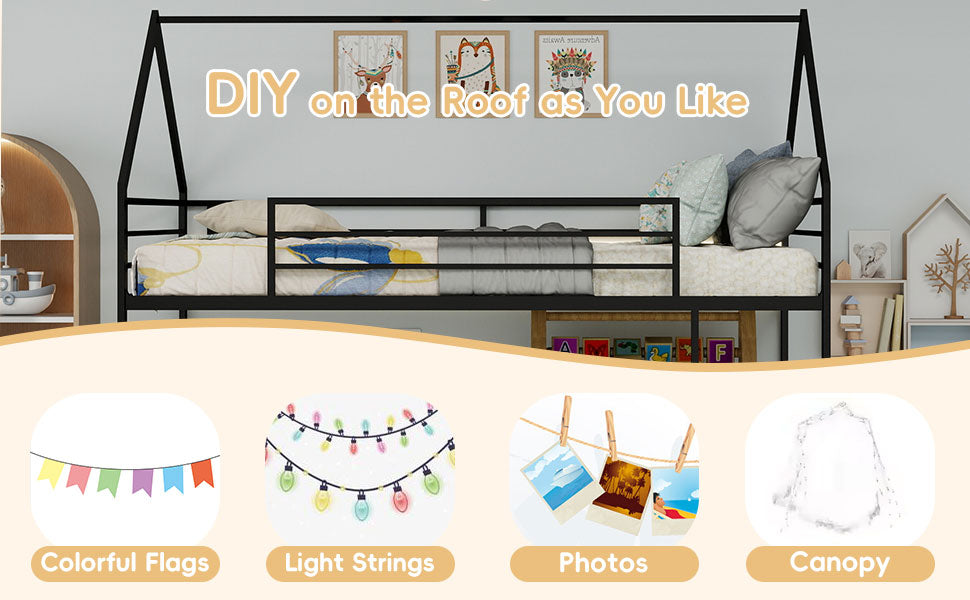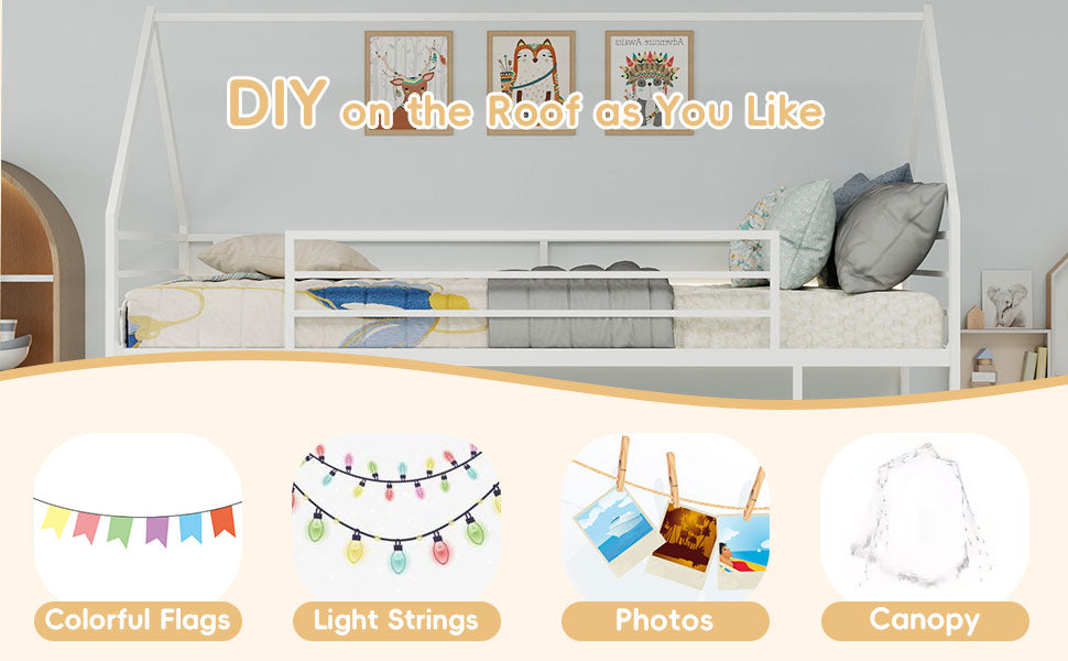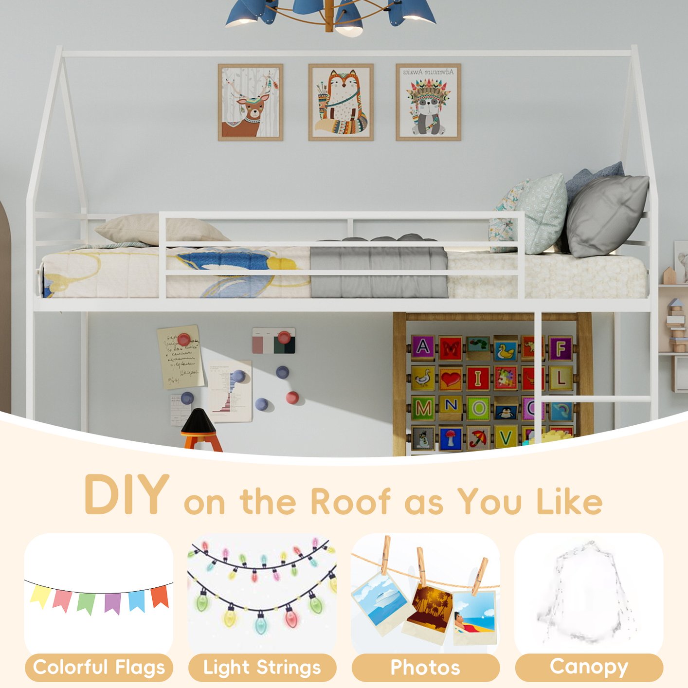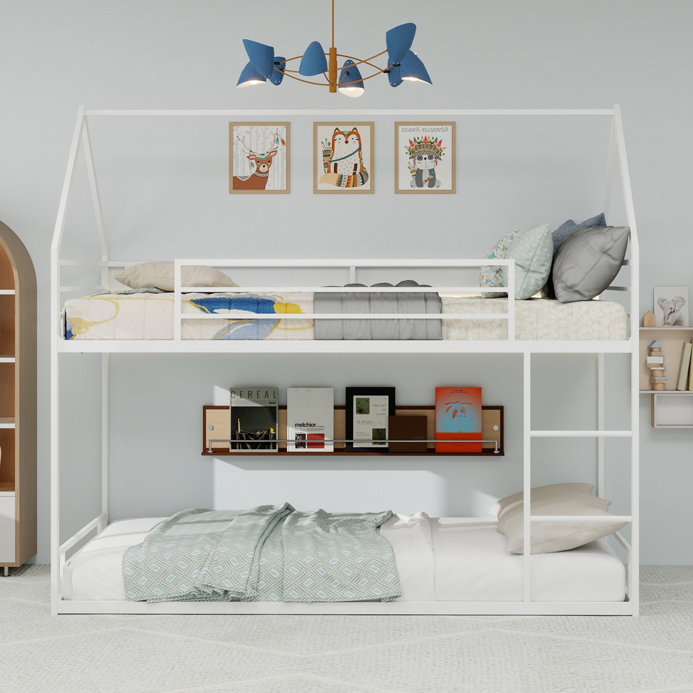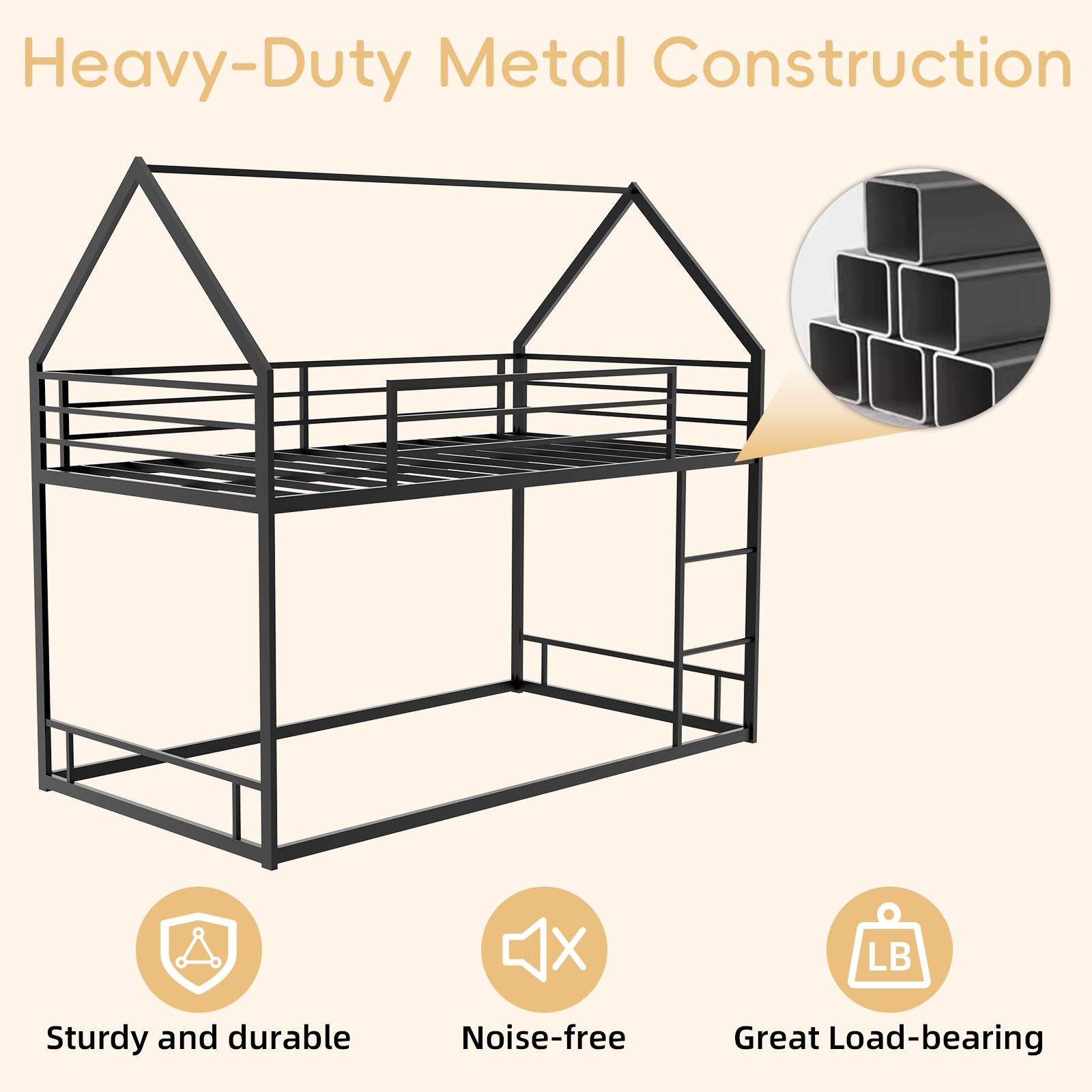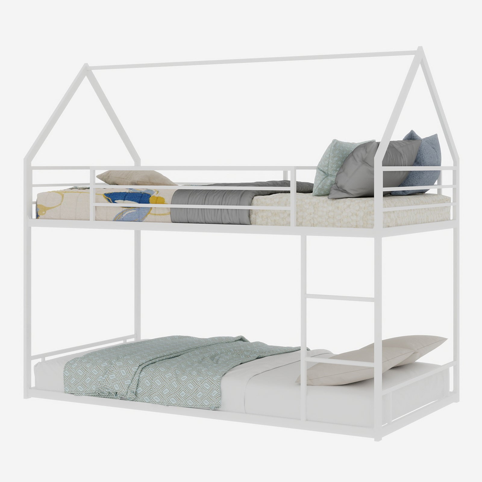 Give your children a safe, space-saving sleeping solution with this heavy-duty metal twin-over-twin bunk bed. Designed for compact rooms and everyday family use, it combines sturdy iron construction, noise-reducing features, and full guardrails for secure sleep on the top bunk. The low-profile design keeps the lower bed close to the floor while the integrated ladder and solid slat system eliminate the need for box springs, making setup simple and mattresses stable.