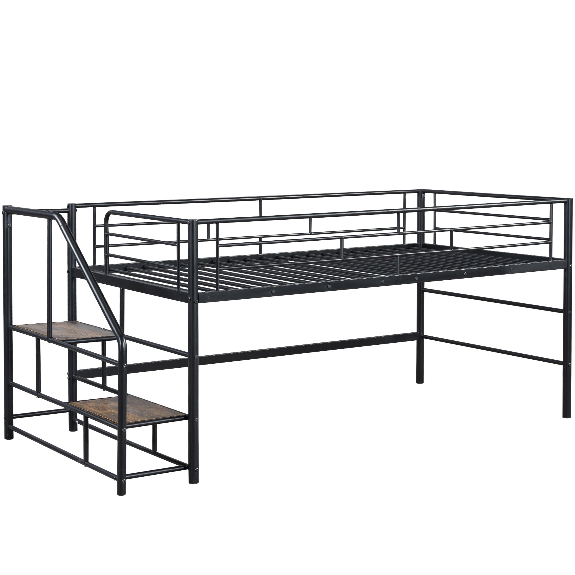 Create a fun, space-saving sleep and play area with this sturdy mid loft twin bed. Designed for children, it raises the sleeping platform to free up floor space underneath while keeping access safe and simple with a ladder-style staircase. Built from durable metal and engineered wood components and finished in versatile black, this loft bed balances safety, stability, and modern style for a long-lasting bedroom solution.