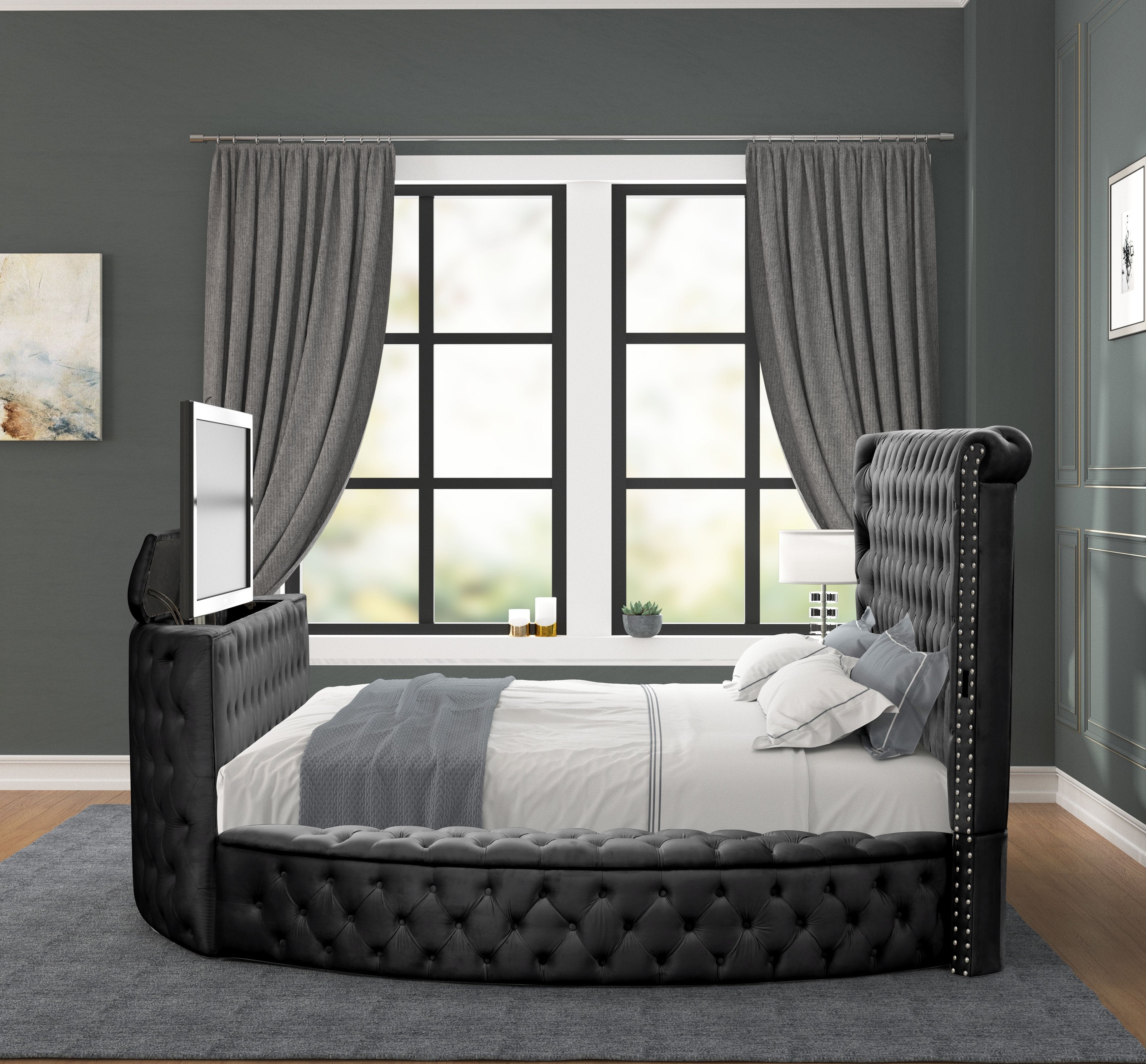 Sink into modern luxury with this exquisitely crafted upholstered bed that blends elegant design with everyday convenience. Built from a combination of solid and engineered wood and finished in a sleek black, the bed features a plush, tufted velvet headboard and footboard for a sophisticated look and comfortable support. Practical touches — including side storage, built‑in USB chargers, and a versatile footboard that doubles as a TV stand — make this piece ideal for contemporary bedrooms where style and function meet.
