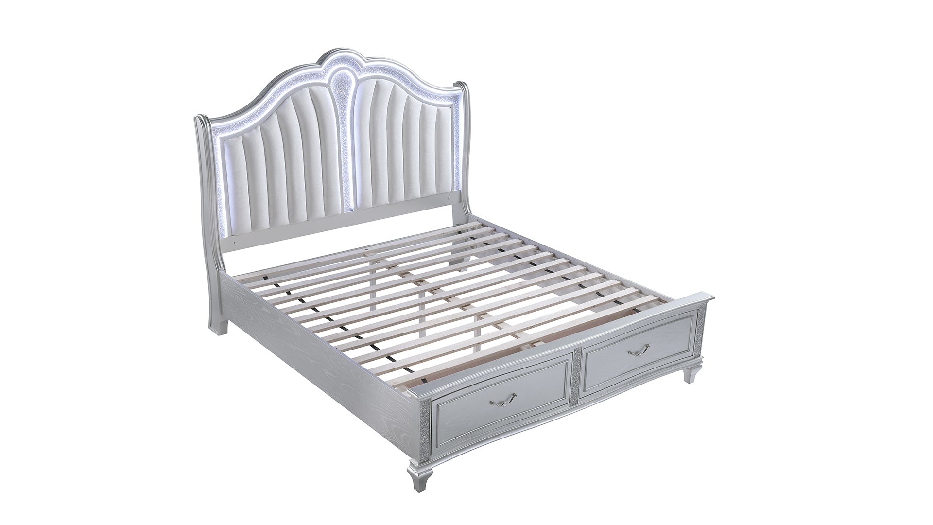 Transform your bedroom into a modern sanctuary with this luxurious upholstered queen bed. Combining contemporary lines, sparkling crystal accents, and integrated LED lighting, it delivers both visual impact and everyday comfort. Thoughtful storage and durable wood construction make it a practical centerpiece for any sleep space.