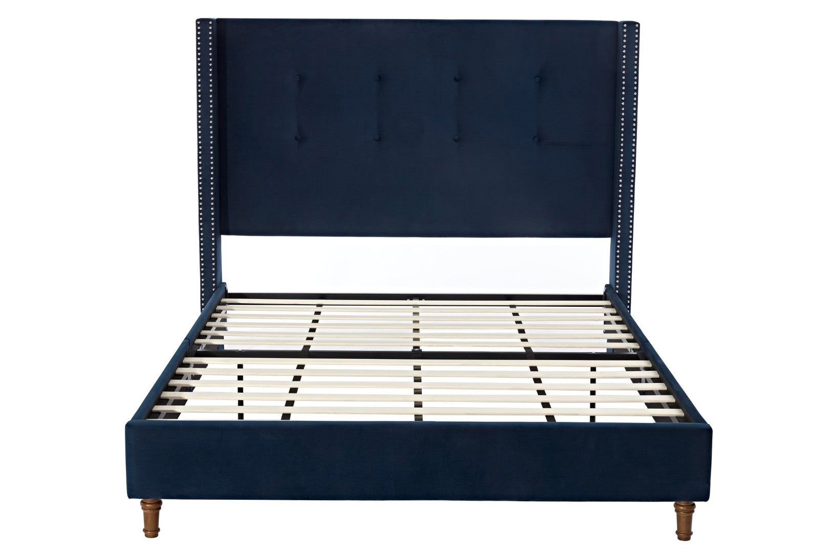 Create a luxurious focal point for your bedroom with this elegant upholstered queen bed. Wrapped in plush blue velvet and finished with traditional hand-buttoned tufting and wingback sides, this bed blends classic European styling with modern convenience—no box spring required. Thoughtful construction, decorative nailhead trim, and walnut-effect solid wood feet deliver both visual appeal and lasting support, while the slatted base and metal side rails ensure mattress stability and breathability.