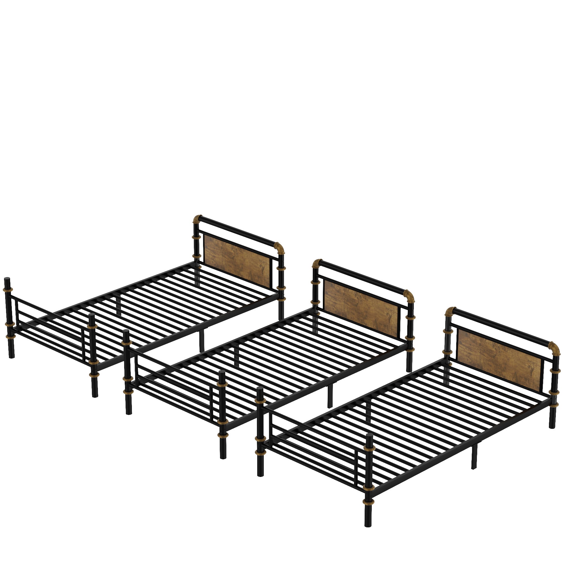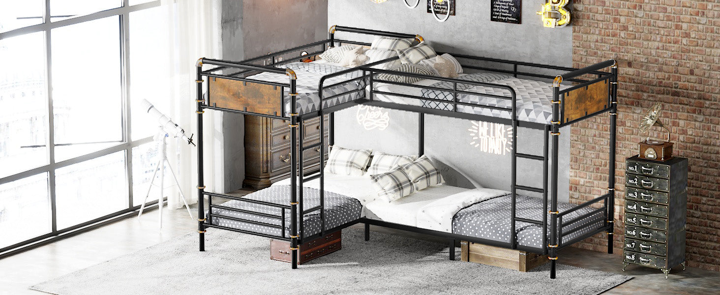 This heavy-duty quad bunk bed blends industrial minimalism with practical, family-friendly design to maximize sleeping space without sacrificing strength or style. Built from sturdy metal with rustic wood accents, it offers versatile configurations—use it as a single quad unit, detach to create a triple bunk, or divide into three separate twin beds—making it ideal for large families, guest rooms, or shared kids’ rooms.