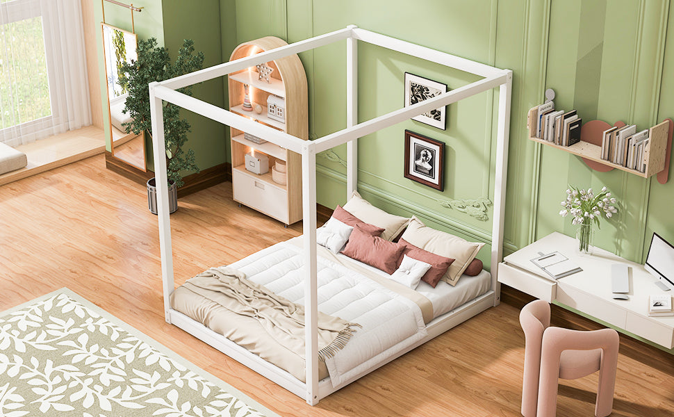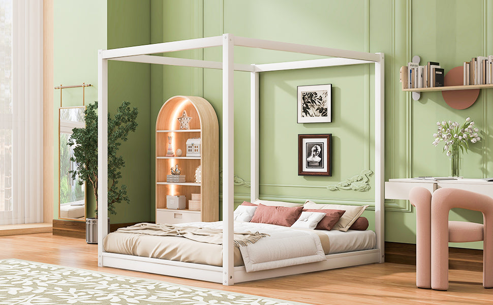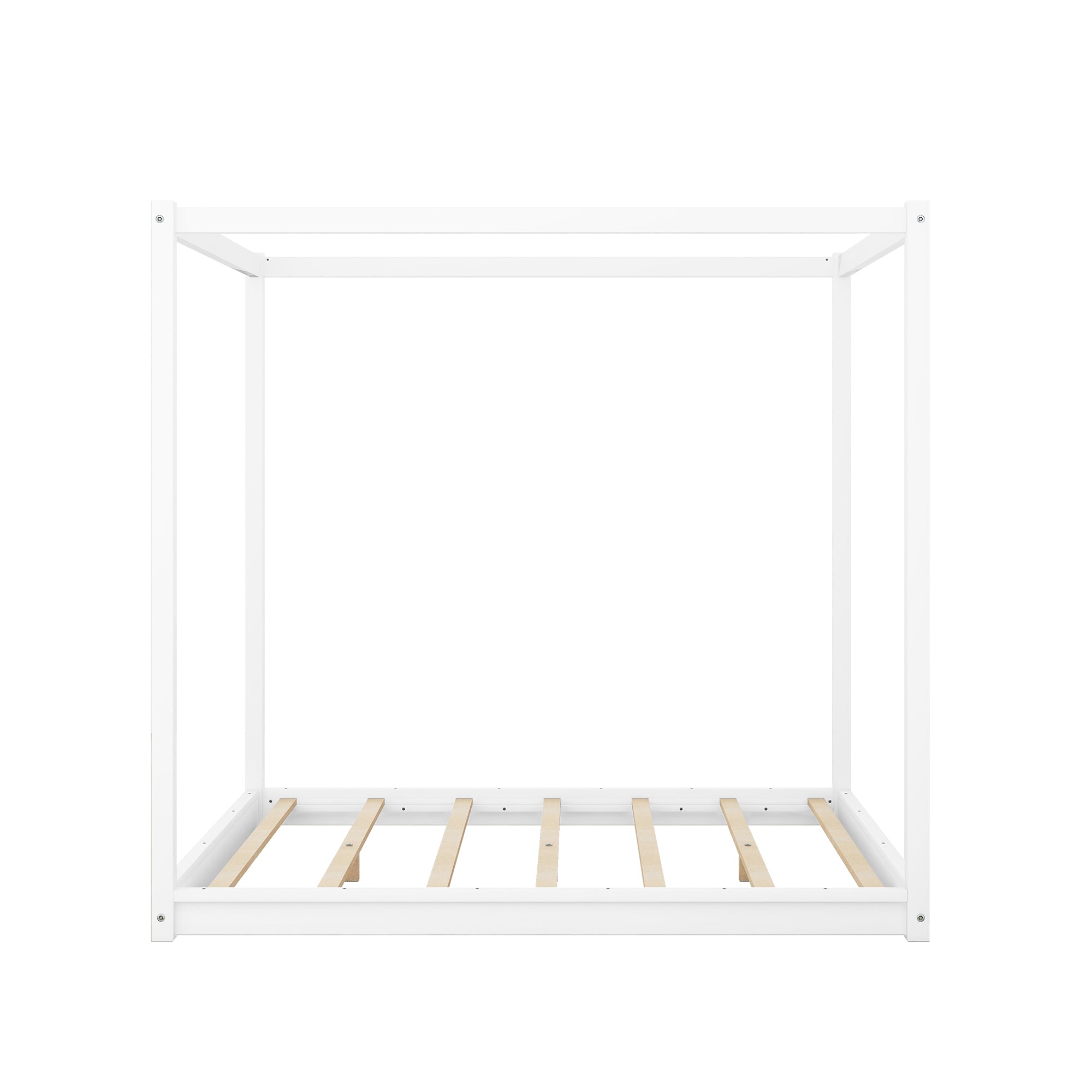 Bring classic elegance and sturdy support to your bedroom with this white queen-size canopy platform bed. Crafted from solid pine and MDF with a clean, versatile silhouette, it offers reliable durability, excellent ventilation from a slatted base, and the option to dress it up with curtains or luxe bedding for a personalized canopy look. No box spring required—just add your mattress and linens for an instant bedroom upgrade.