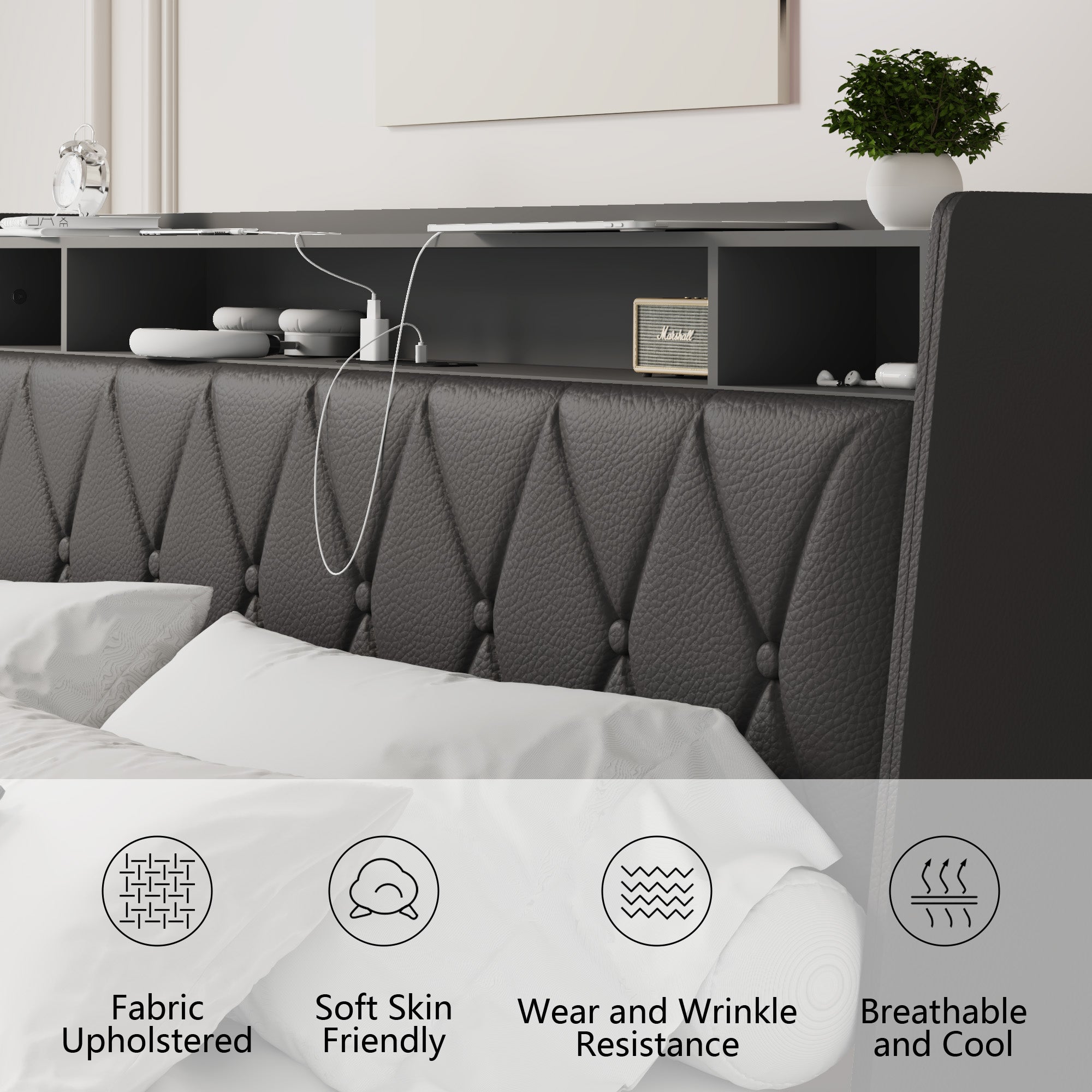 - Built-in Outlets & Charger: Conveniently placed power outlets and USB charging ports in the headboard keep phones, tablets, and bedside lamps powered without messy cords.