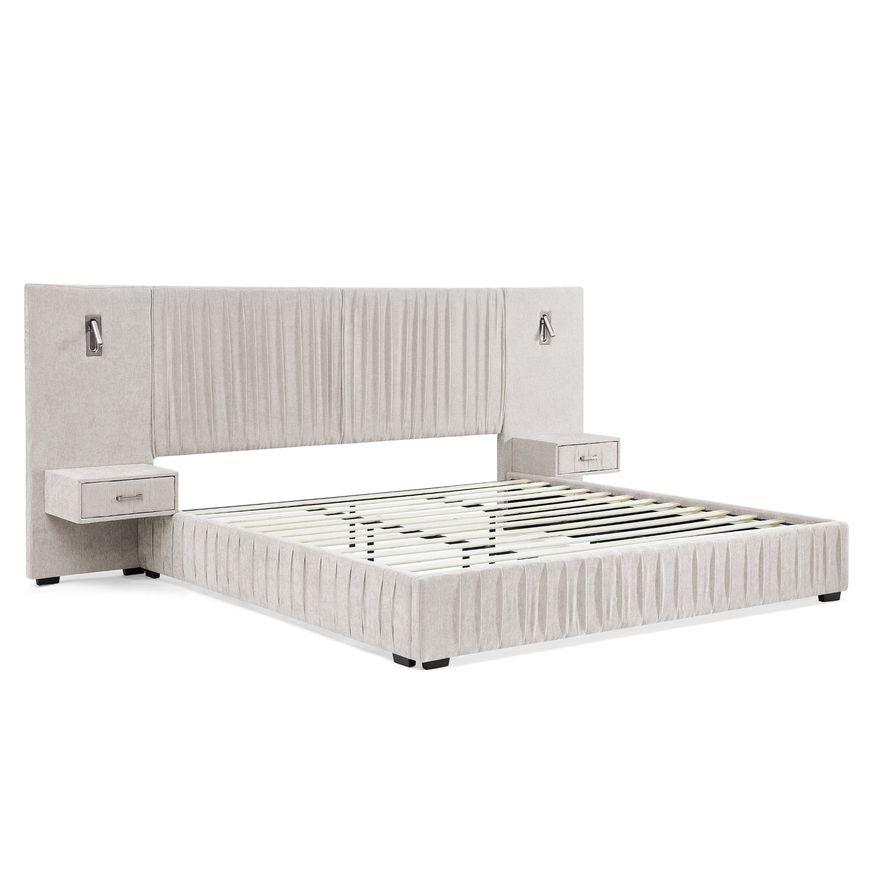 Transform your bedroom with this modern, upholstered queen platform bed—designed for comfort, convenience, and contemporary style. Wrapped in soft chenille with an elegant pleated headboard, the grounded frame eliminates the need for a box spring while providing sturdy support. Thoughtfully integrated bedside features and an adjustable-angle lamp make this bed a practical centerpiece for nightly routines and relaxed lounging.