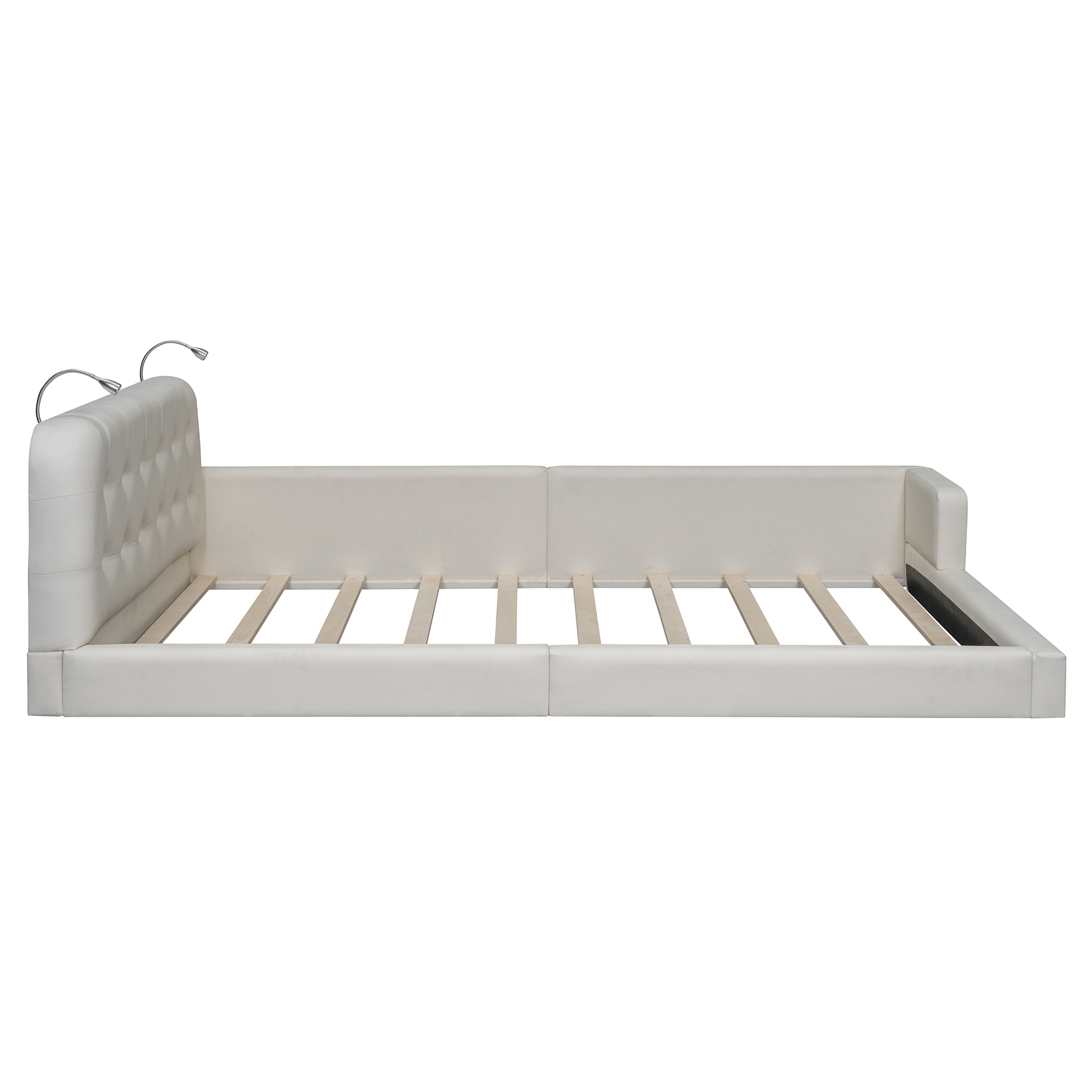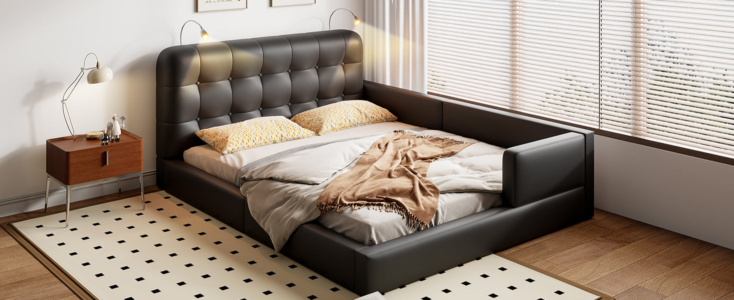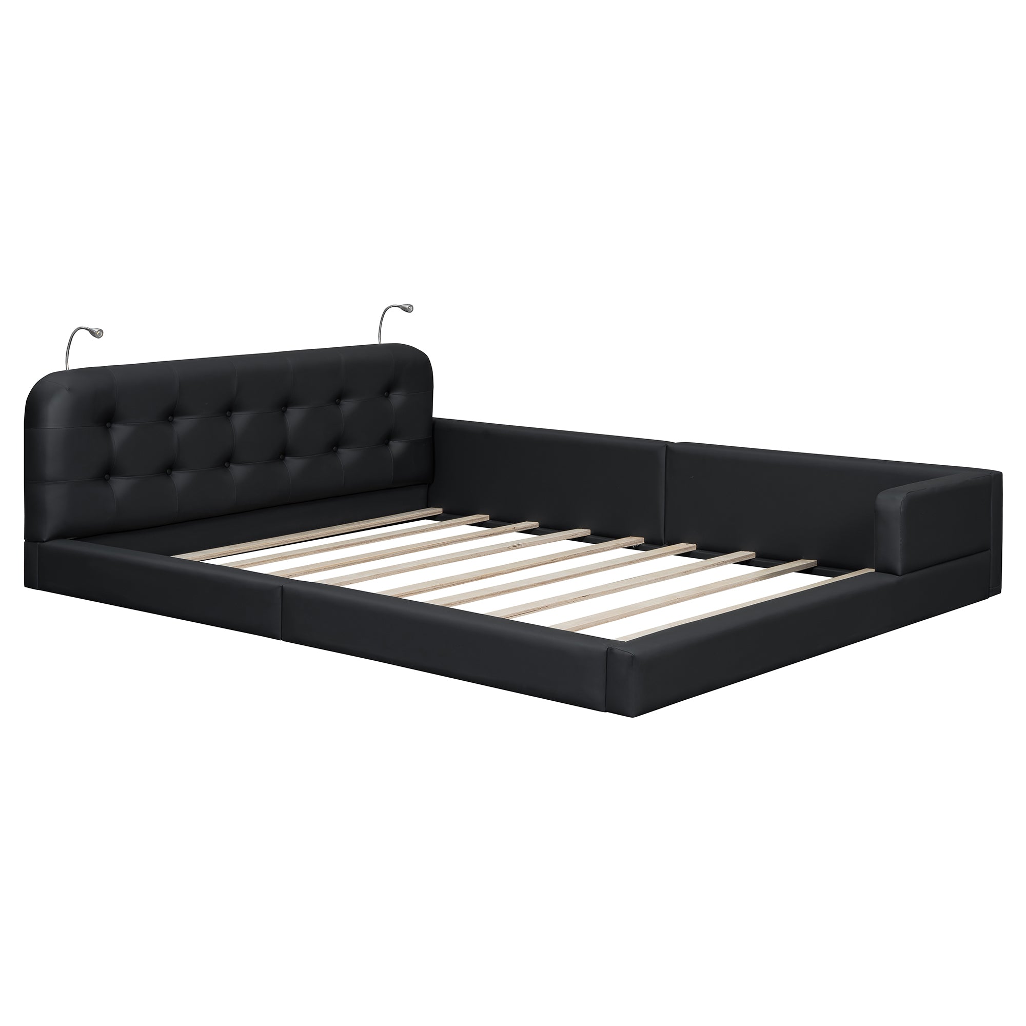 Transform your bedroom into a modern, comfortable retreat with this upholstered platform bed. Clean lines and a soft PU leather finish deliver a luxurious look while durable construction ensures long-lasting support. The integrated headboard features two adjustable reading lights for targeted illumination without bedside lamps, making it ideal for late-night readers or relaxed TV time. With a sturdy slat system and high weight capacity, this bed balances style, convenience, and reliable performance.