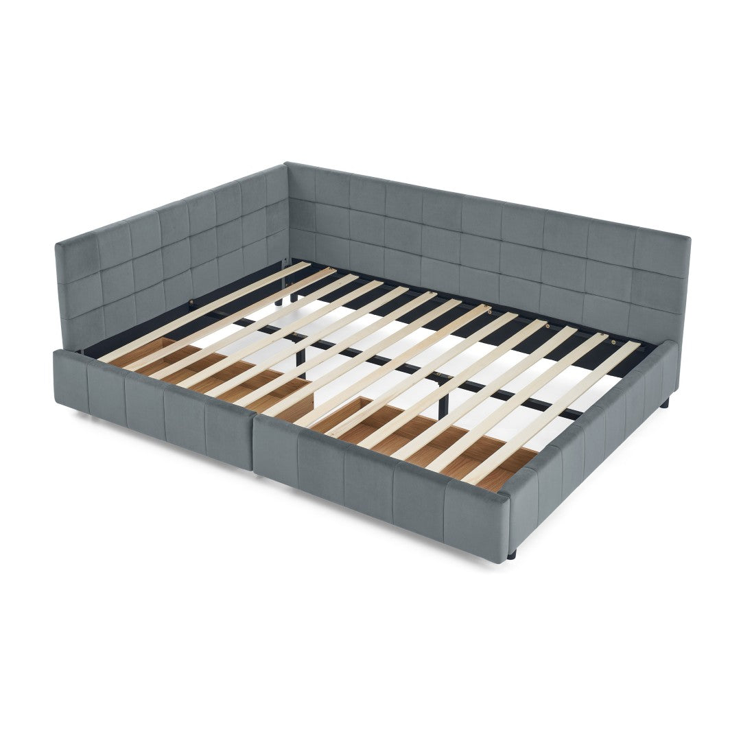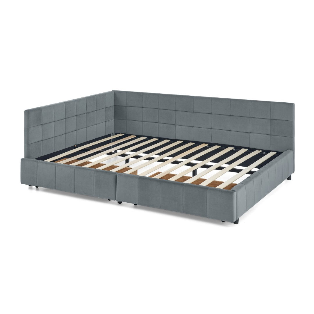 A stylish and multifunctional upholstered queen bed that blends modern design with practical storage and comfortable seating. Padded in soft grey velvet with tufted detailing, this piece serves as both a bedroom centerpiece and a functional sofa-like daybed thanks to its supportive backrest and armrests. Built with sturdy plywood and ample under-bed storage, it’s ideal for small spaces or multi-use rooms where comfort and organization are equally important.