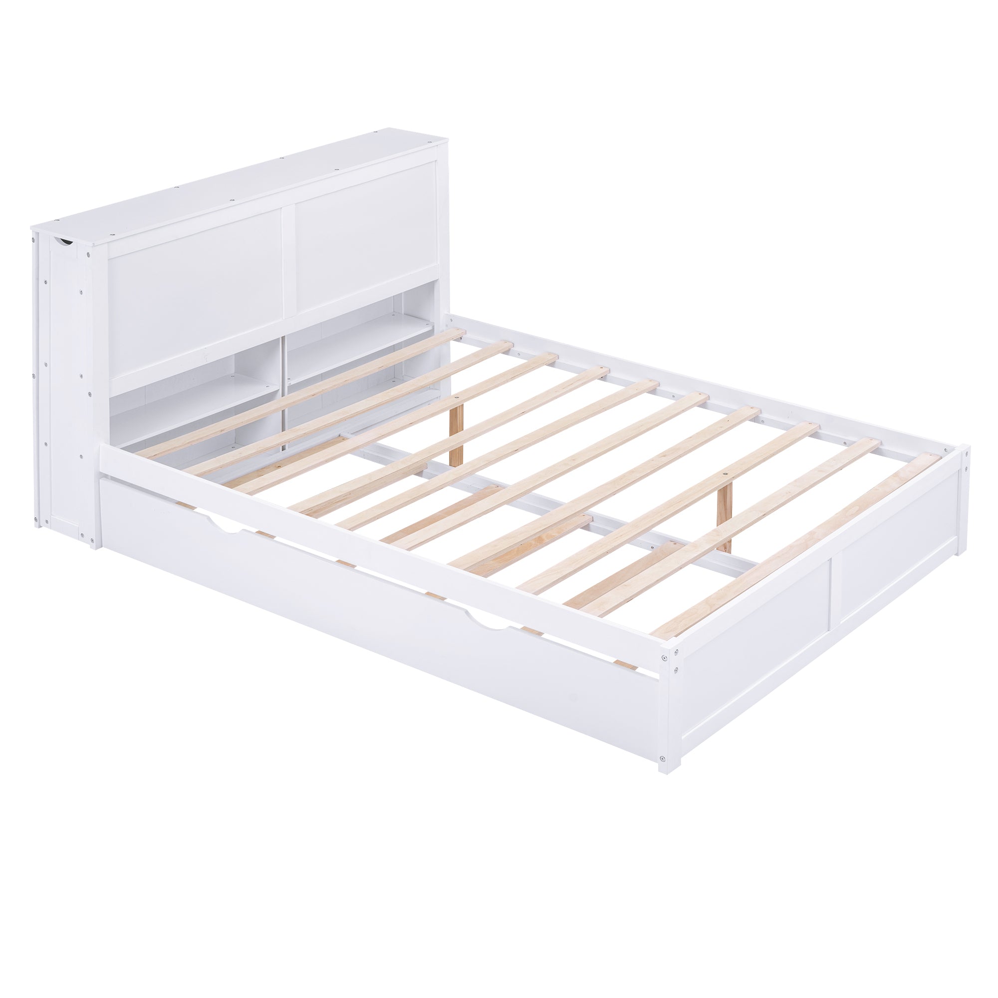 This elegant white platform bed combines practical storage and clean, modern design to maximize bedroom space without sacrificing style. Built from solid pine and MDF, it offers durable construction, versatile configuration with a Twin XL trundle, and convenient pull-out shelving integrated into the headboard—ideal for books, decor, and bedside essentials. It’s a smart choice for guest rooms, shared spaces, or anyone seeking a tidy, organized sleep area.