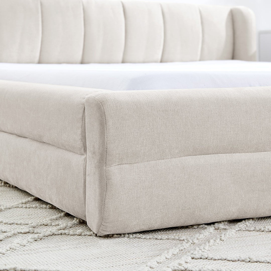 - Comfort & Finish: Plush padding beneath the fabric headboard for comfortable back support when sitting up; neutral beige upholstery complements diverse bedroom palettes.