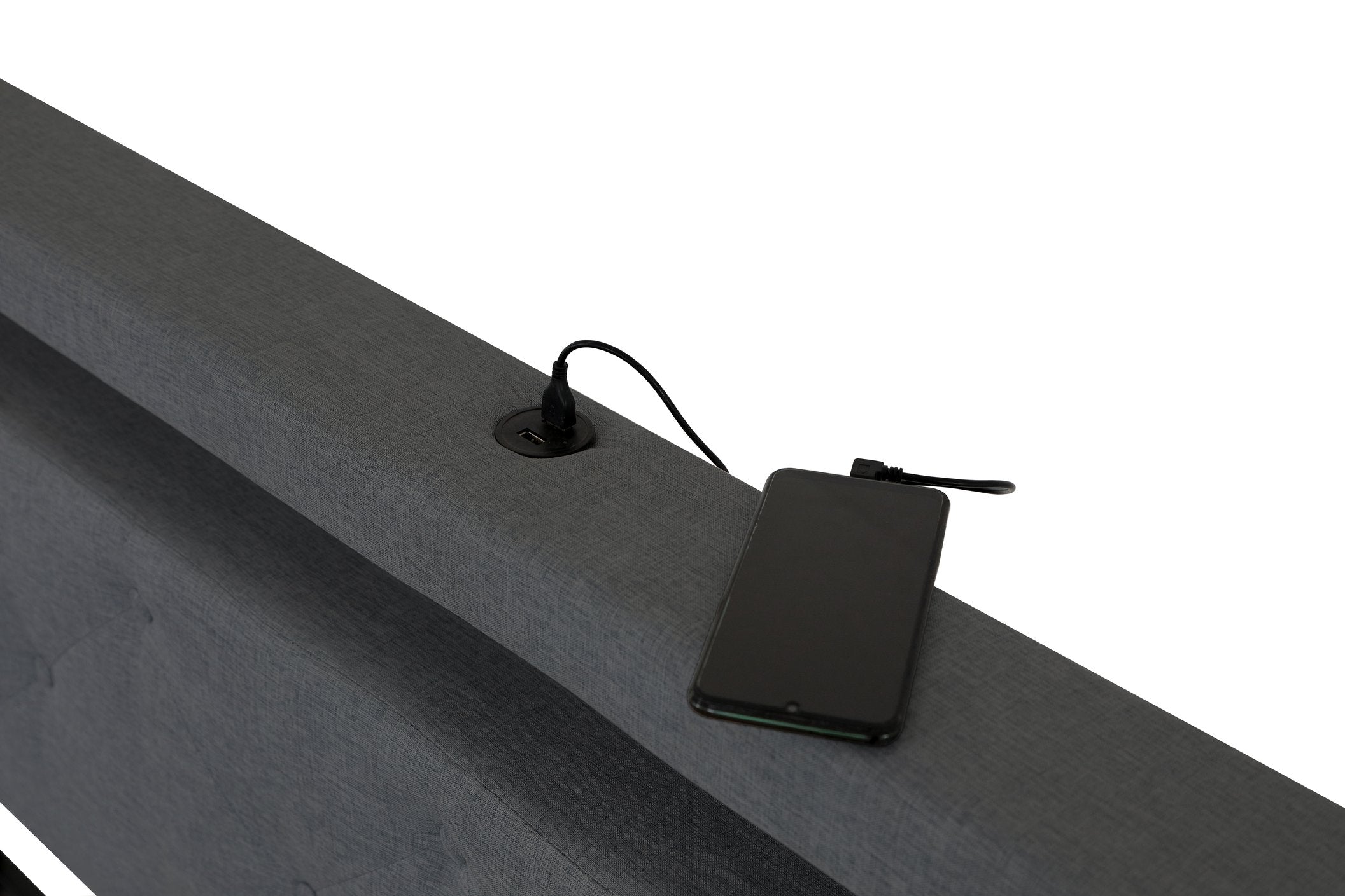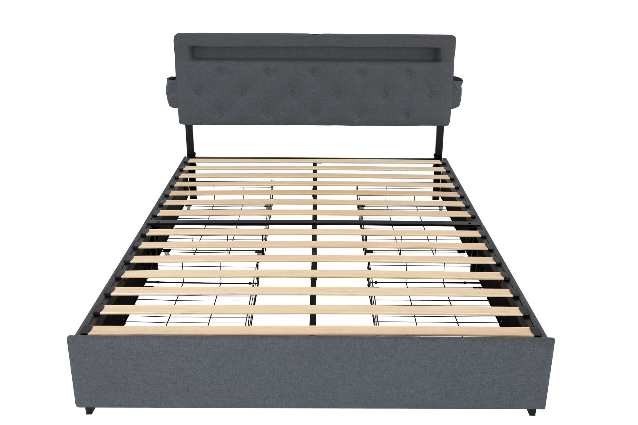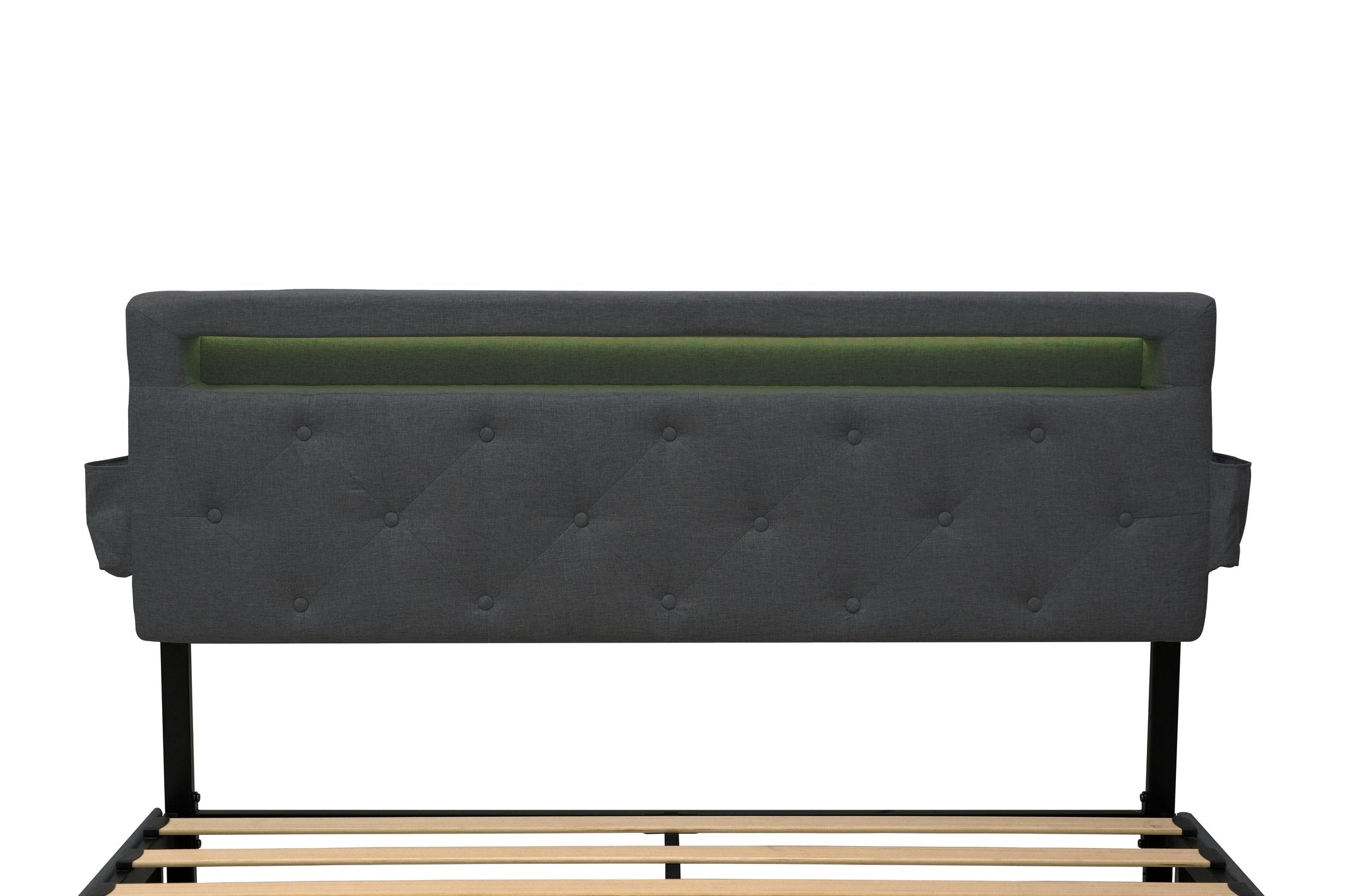 Upgrade your bedroom with a stylish, tech-ready queen bed frame that blends comfort, storage, and modern convenience. Upholstered in dark gray, this platform bed features an integrated headboard with ambient LED lighting and a built-in USB charging station—designed to streamline your nightly routine while maximizing space and durability.