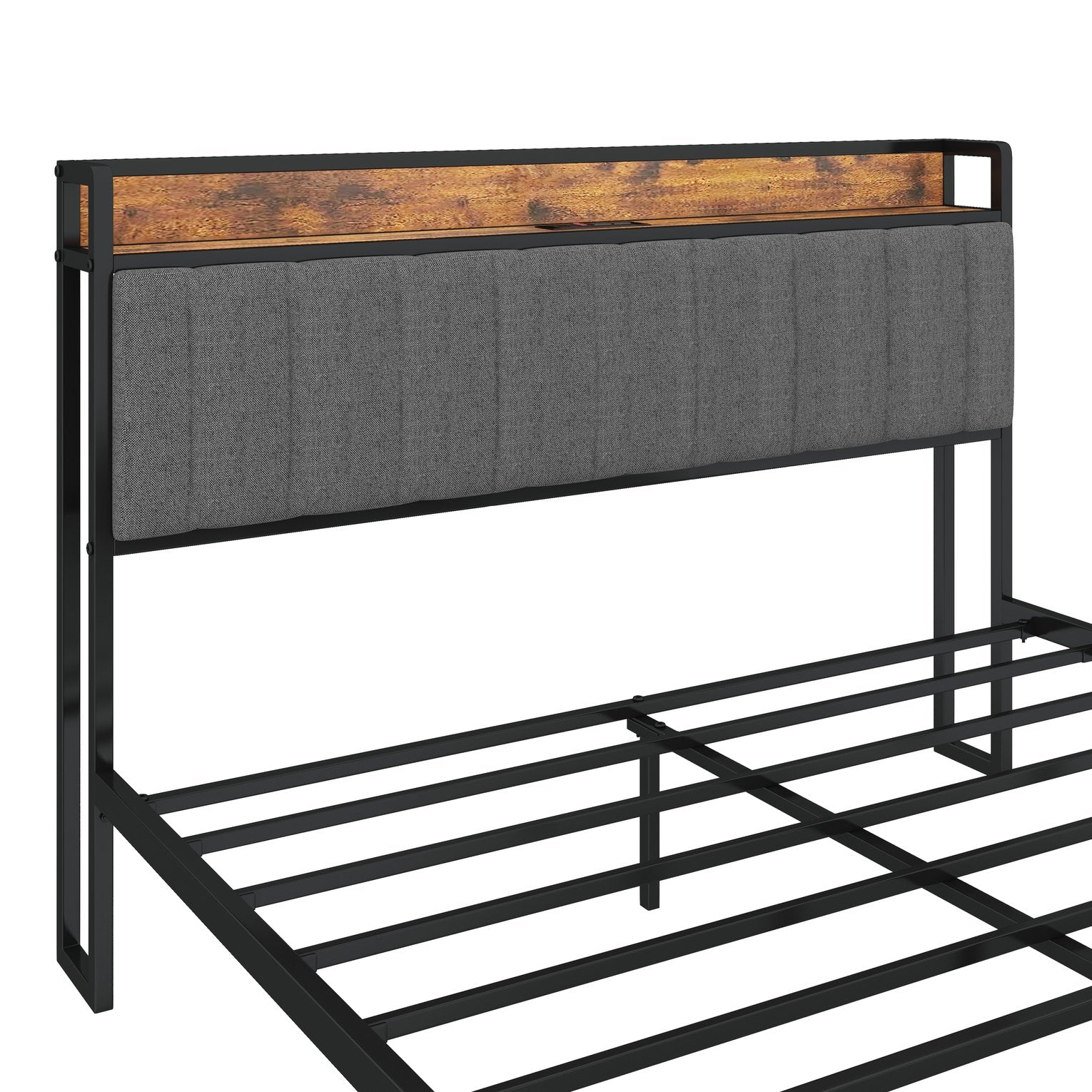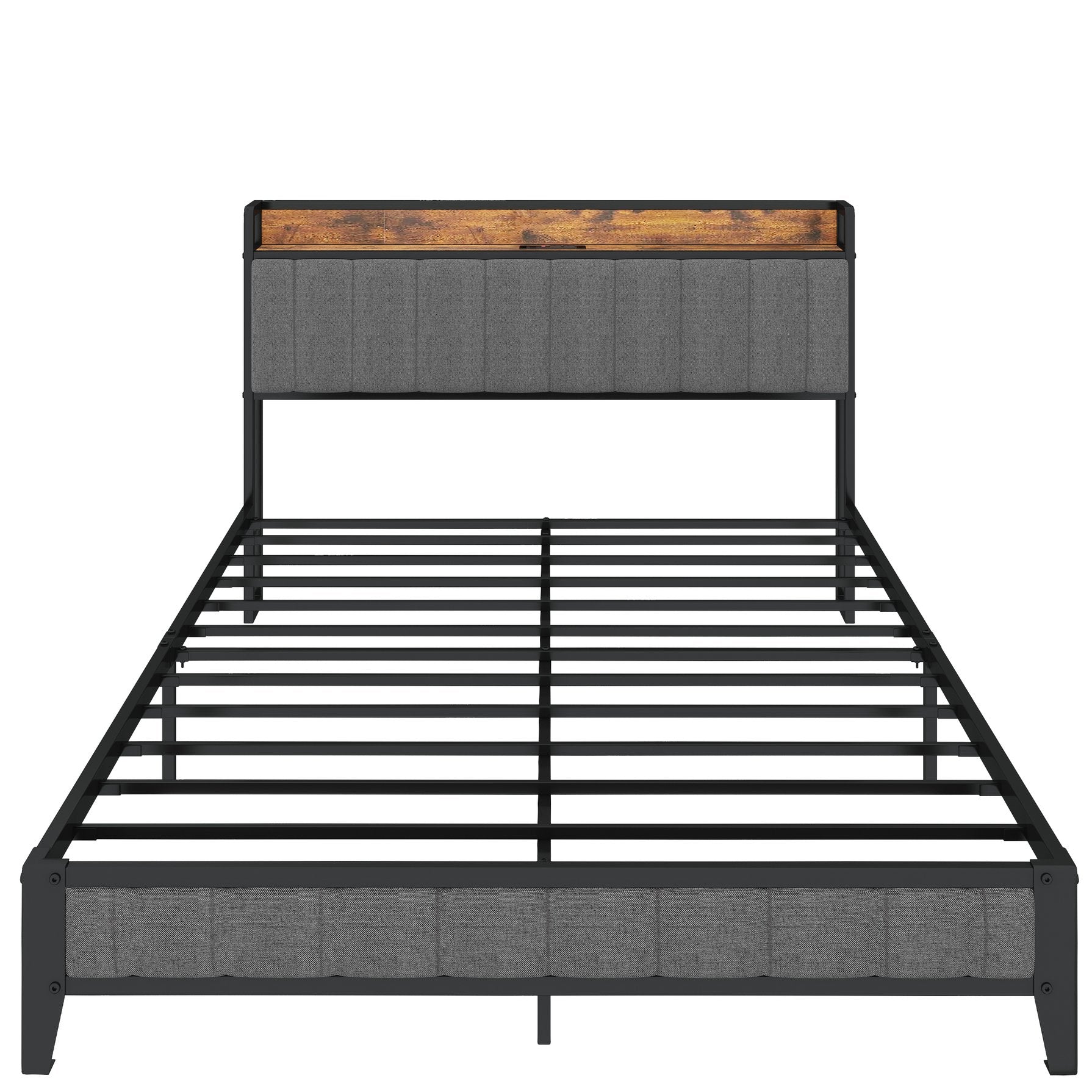 Give your bedroom a smart, sturdy upgrade with this queen-size platform bed that combines modern convenience and classic Americana styling. The grey upholstered headboard features an integrated charging station so your devices stay powered and within reach, while heavy-duty metal slats and reinforced legs deliver long-lasting support without the need for a box spring. Thoughtful details—like a vintage shelf, generous under-bed clearance, and easy-to-follow assembly—make this bed both practical and attractive.