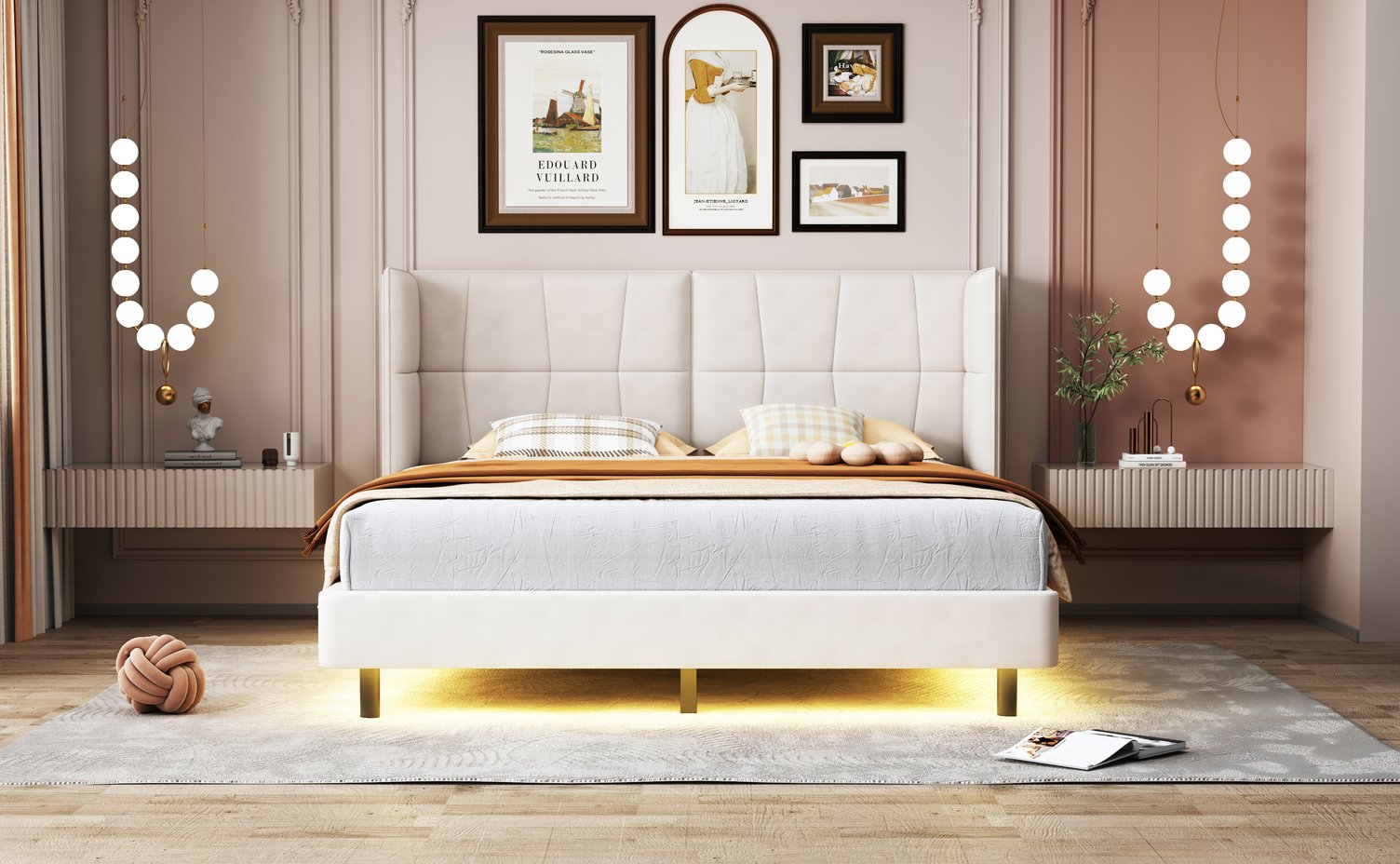 Elevate your bedroom with a modern upholstered platform bed that blends contemporary design, soft linen upholstery, and practical features like built-in LED lighting. This queen-size bed combines a stylish U-shaped headboard, durable construction, and convenient assembly to create a comfortable, customizable sleeping environment perfect for relaxing or entertaining ambient moods.