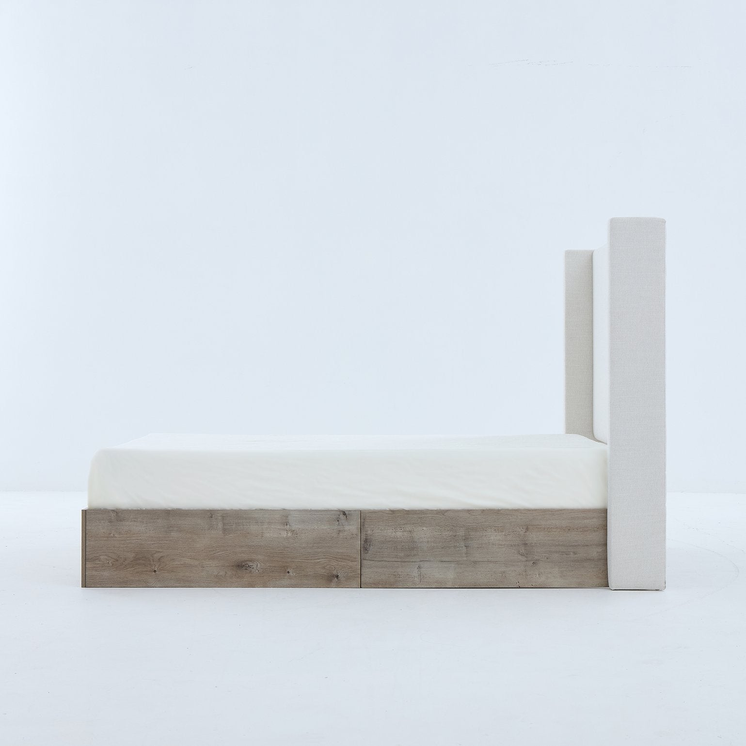 Elevate your bedroom with a refined blend of rustic and modern farmhouse style. This upholstered wingback bed features a textured ivory canvas chenille headboard and a warm light oak wood base that together create a serene, Scandinavian-inspired aesthetic. The 54" high wingback headboard provides a welcoming focal point and luxurious, supportive comfort—perfect for sitting up with a book or anchoring a minimalist bedroom scheme.