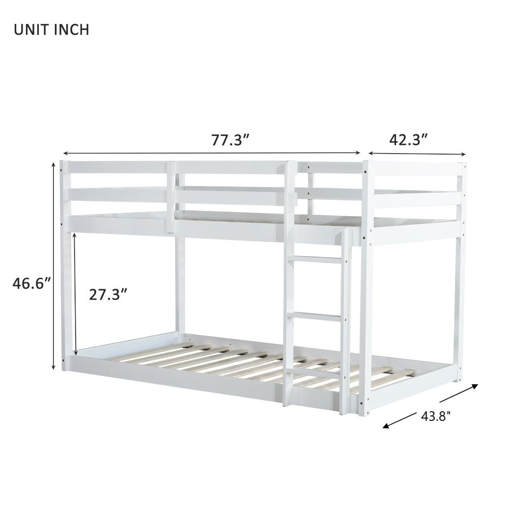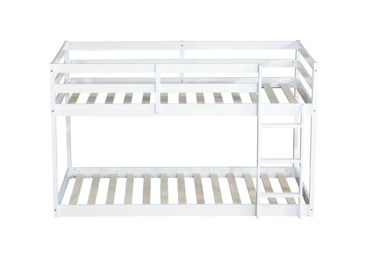 Bring timeless simplicity and sturdy craftsmanship to your child’s room with this solid rubberwood twin-over-twin floor bunk bed. Designed for low height and everyday use, it offers a clean white finish, reinforced slat support for both sleeping platforms, and a versatile open space beneath for storage, play, or an added sleeping area. Thoughtfully built with quality materials and hardware, it balances durability with an understated aesthetic that complements many decor styles.