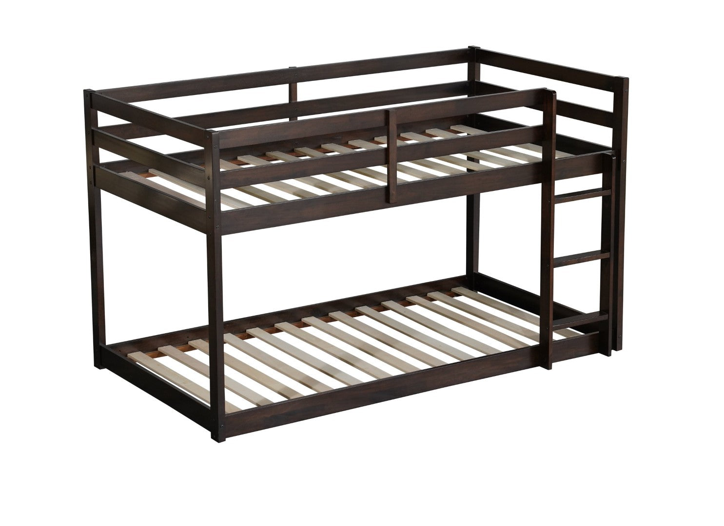 A sturdy, low-profile twin-over-twin floor bunk bed that blends clean, modern lines with durable solid rubberwood construction. Designed for practical everyday use, this espresso-finish bunk maximizes space while providing a stable sleep platform for two children or guests. Its reinforced slat system removes the need for box springs and supports standard low-profile mattresses for a neat, finished look.