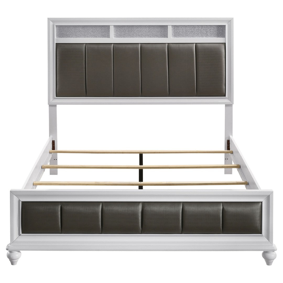 Elevate your master bedroom with a refined blend of modern sophistication and country charm. This upholstered queen panel bed pairs clean white wood with vertically stitched metallic leatherette panels and elegant turned feet for a look that’s both contemporary and inviting. Designed to be the centerpiece of your sleeping space, it offers tasteful texture, subtle sparkle, and sturdy construction for everyday comfort and lasting style.