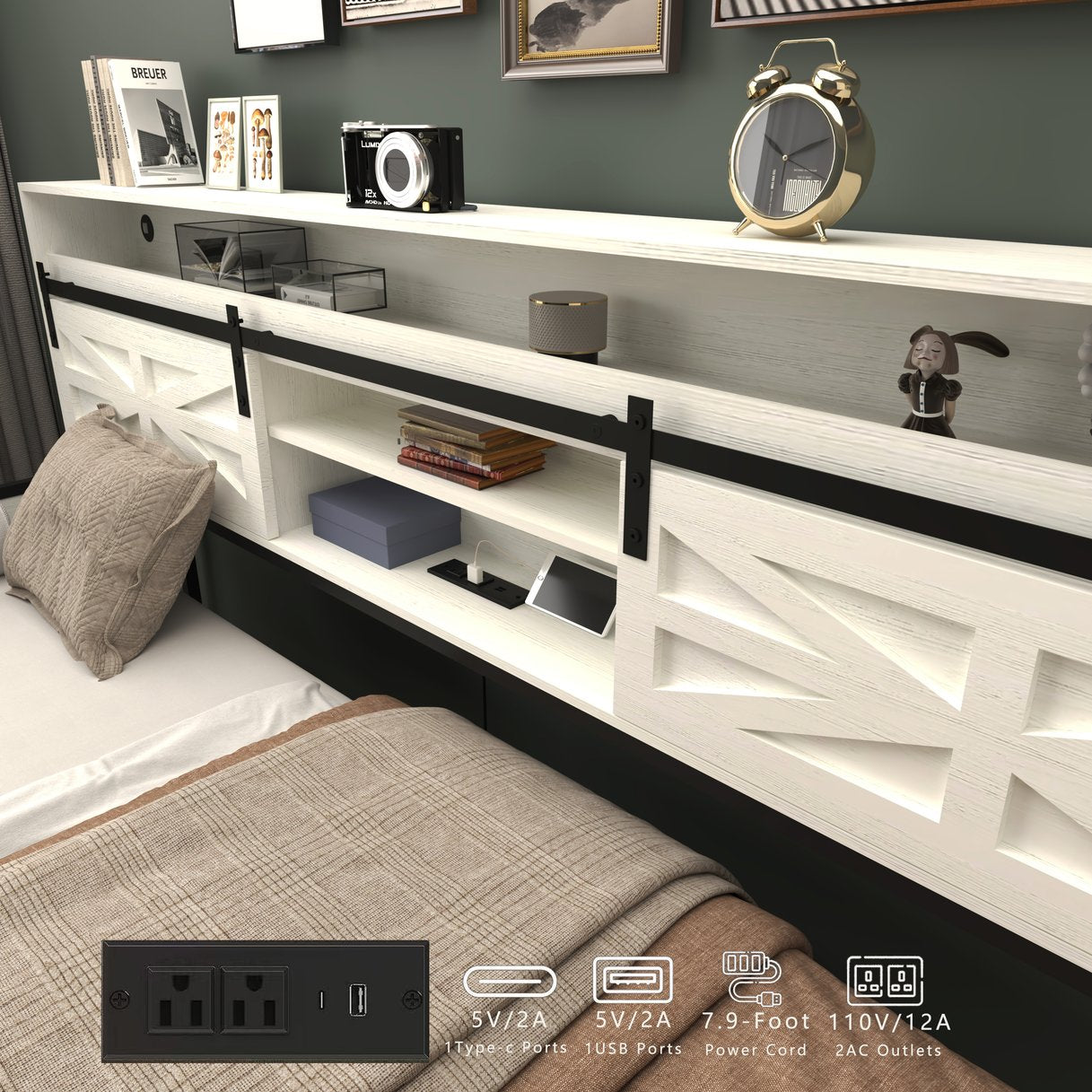 - Spacious Headboard Storage: Farmhouse-inspired headboard features sliding doors that reveal hidden shelf, combining style and functionality. It offers plenty of room to organize personal items while keeping them neatly tucked away