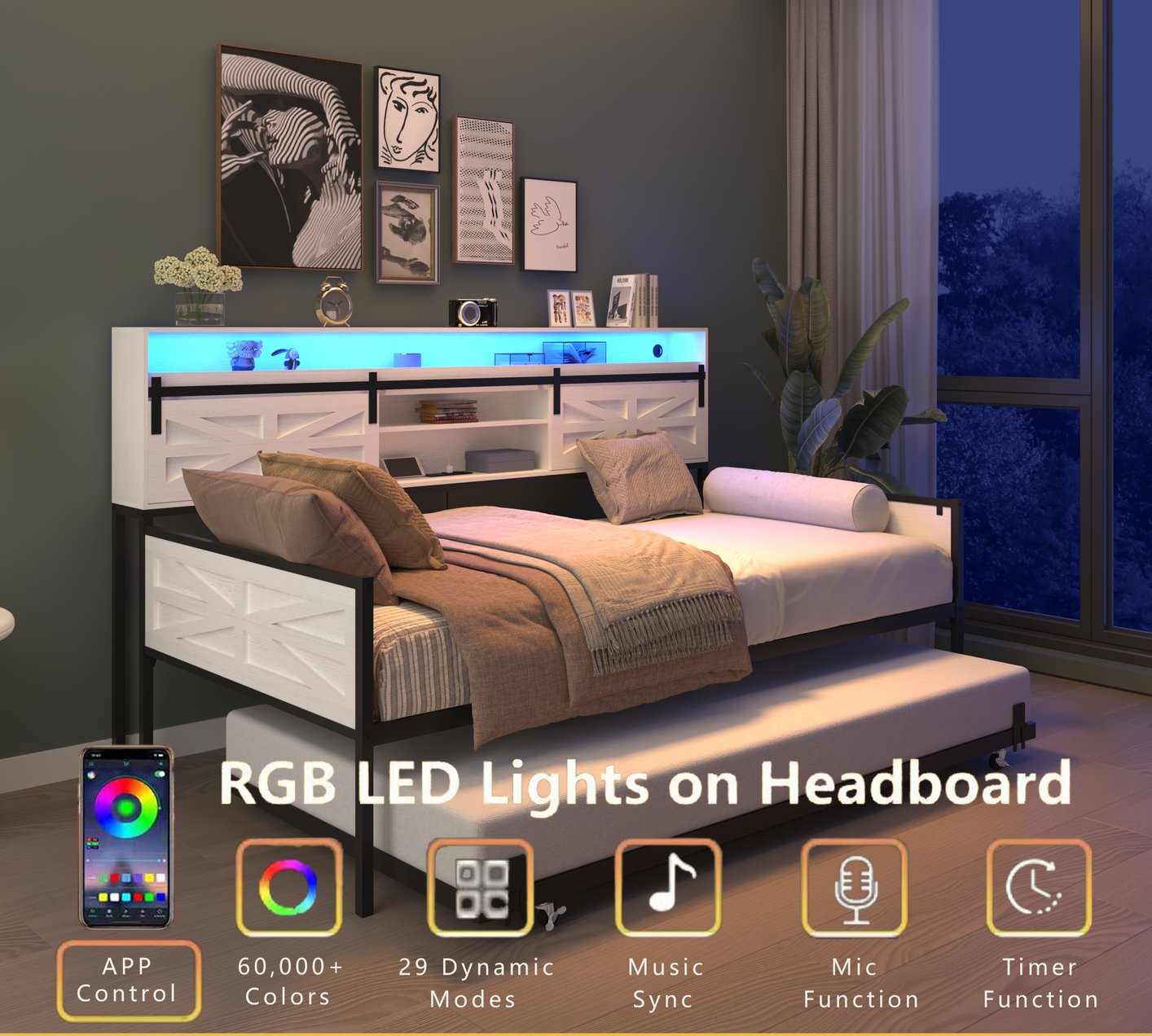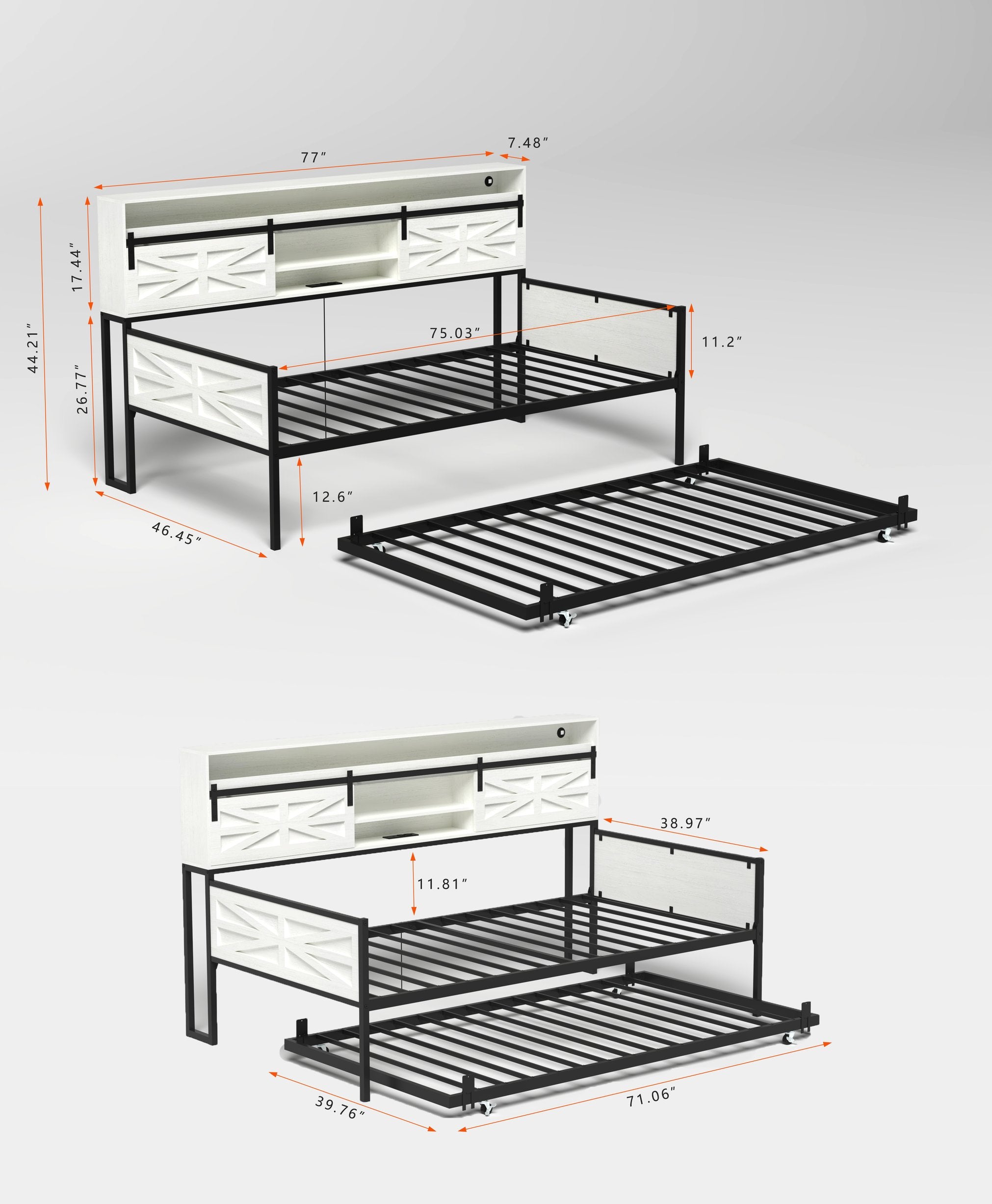 Bring farmhouse charm and modern convenience to your bedroom or guest room with this versatile twin daybed and trundle. Crafted with a glossy white finish and a sliding barn-door headboard, it pairs rustic styling with practical features—built-in charging, customizable LED lighting, hidden storage, and a sturdy frame—making it ideal for everyday use or overnight guests.