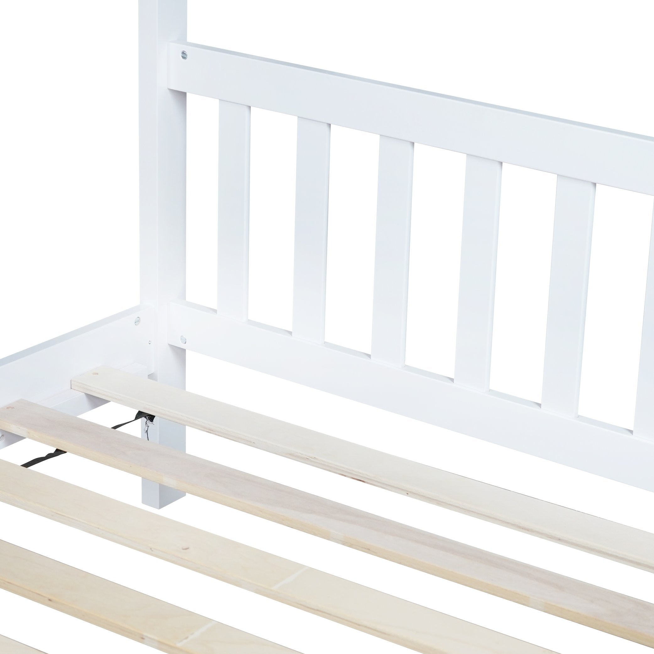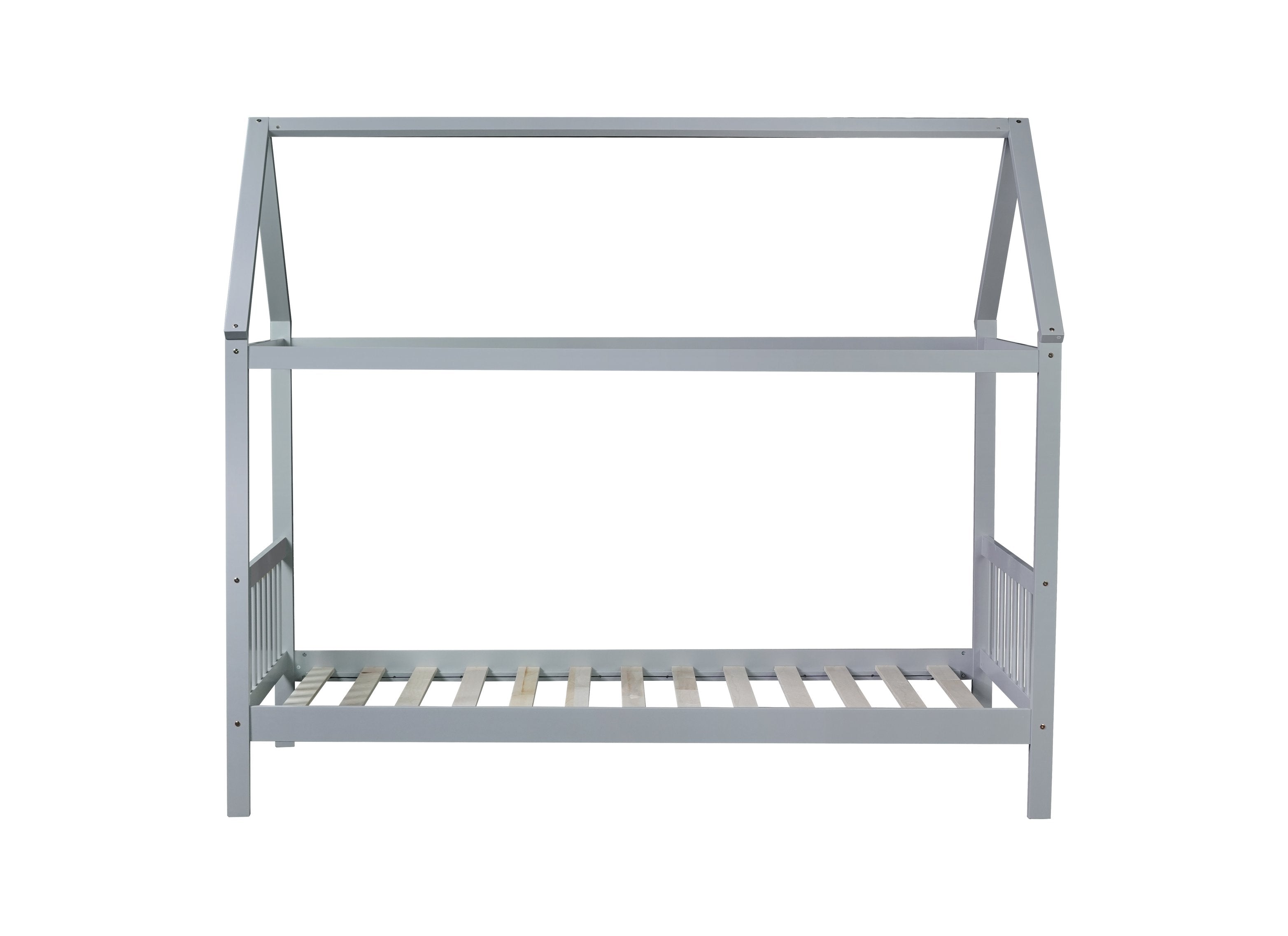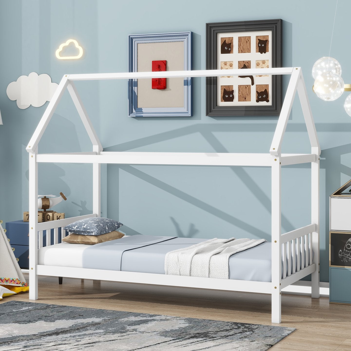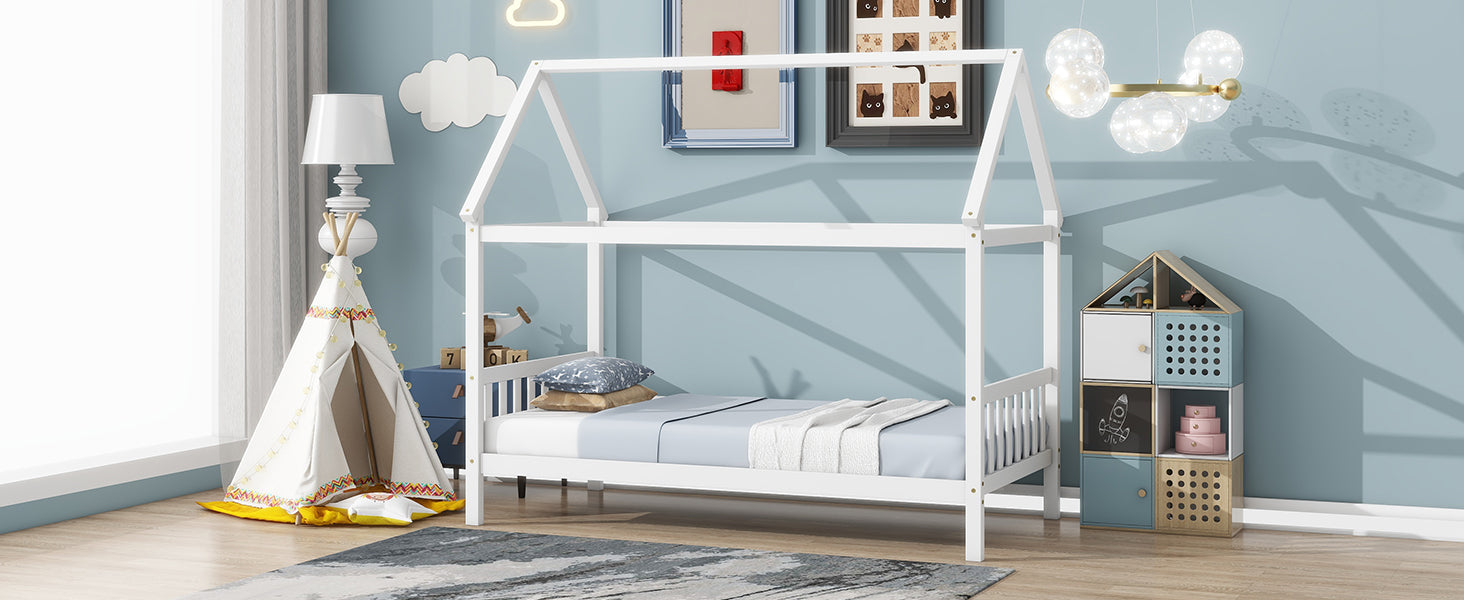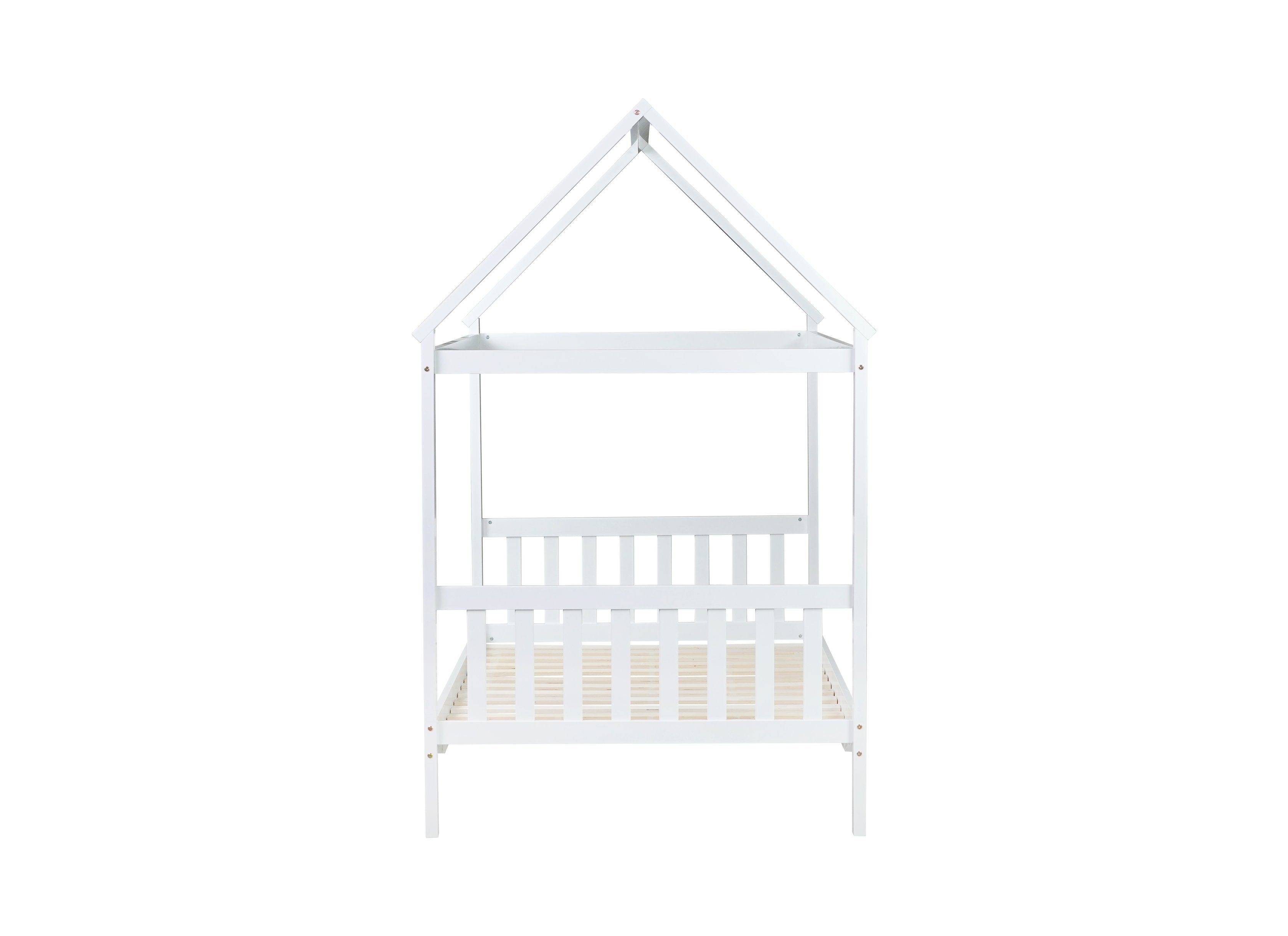 Bring playful charm and clean, contemporary design into a child’s bedroom with this twin house bed. The house-shaped rubberwood frame and crisp white finish create a cozy, architectural focal point that feels like a little home while maximizing space and durability. Thoughtfully designed for safety and simplicity, it supports a low-profile mattress and includes all necessary hardware and instructions for straightforward assembly.