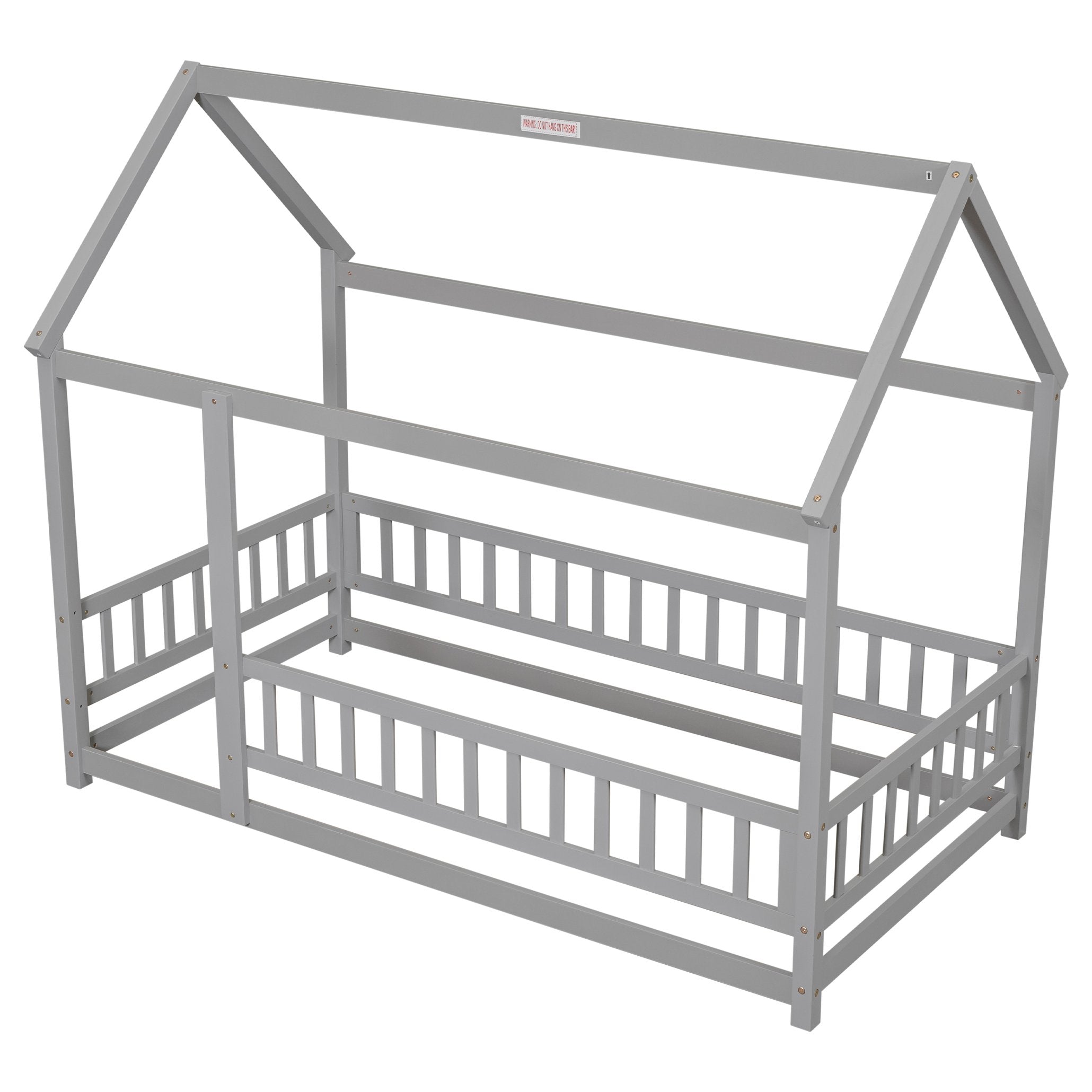 Invite imaginative play and cozy sleep into your child’s room with this charming twin floor bed styled like a little house. The low-profile, house-shaped roof frame and surrounding fence guardrails create a safe, whimsical space that encourages exploration and pretend play while keeping bedtime comfortable and accessible. Durable pine and plywood construction in a soft grey finish blends with many décors and provides a sturdy foundation for daily use.