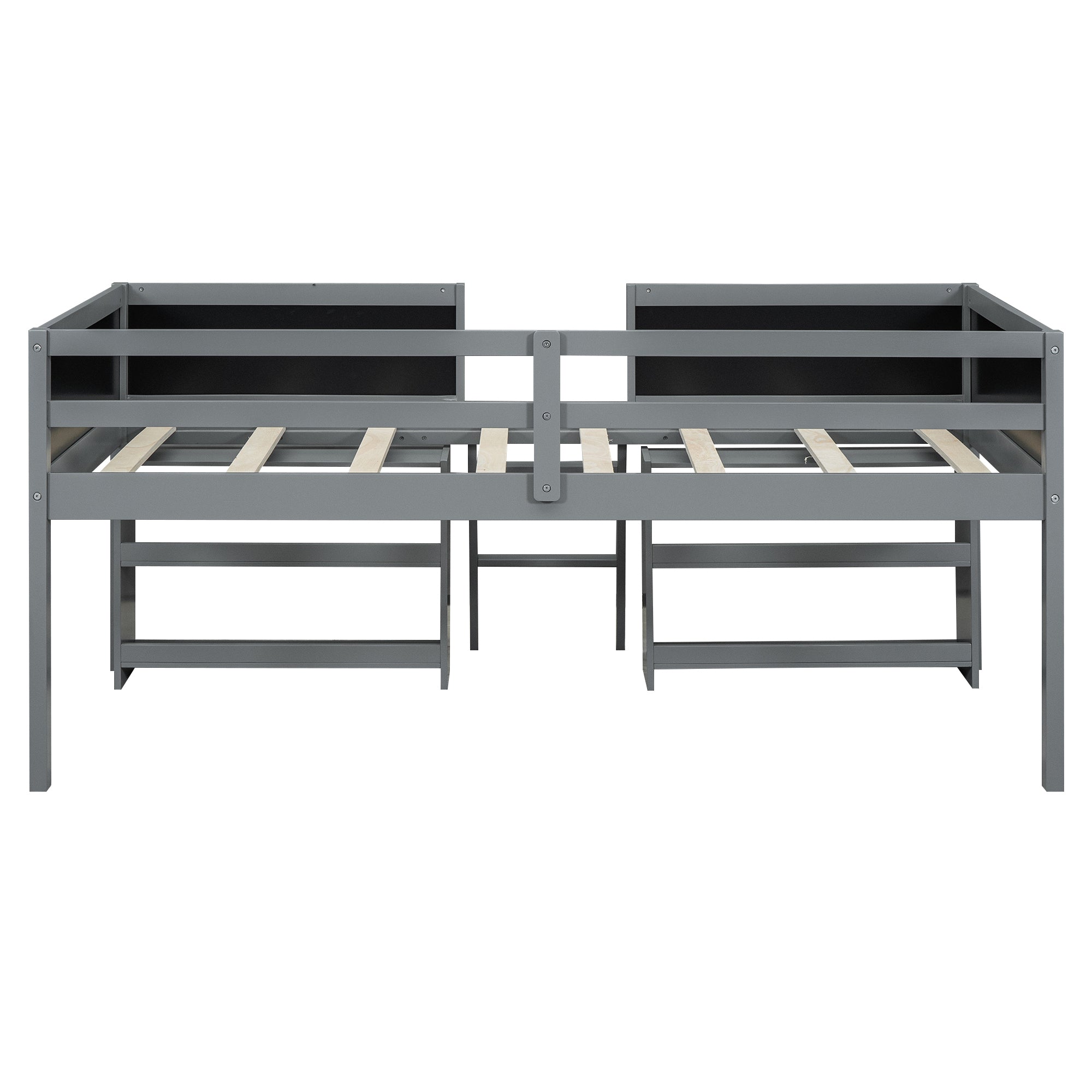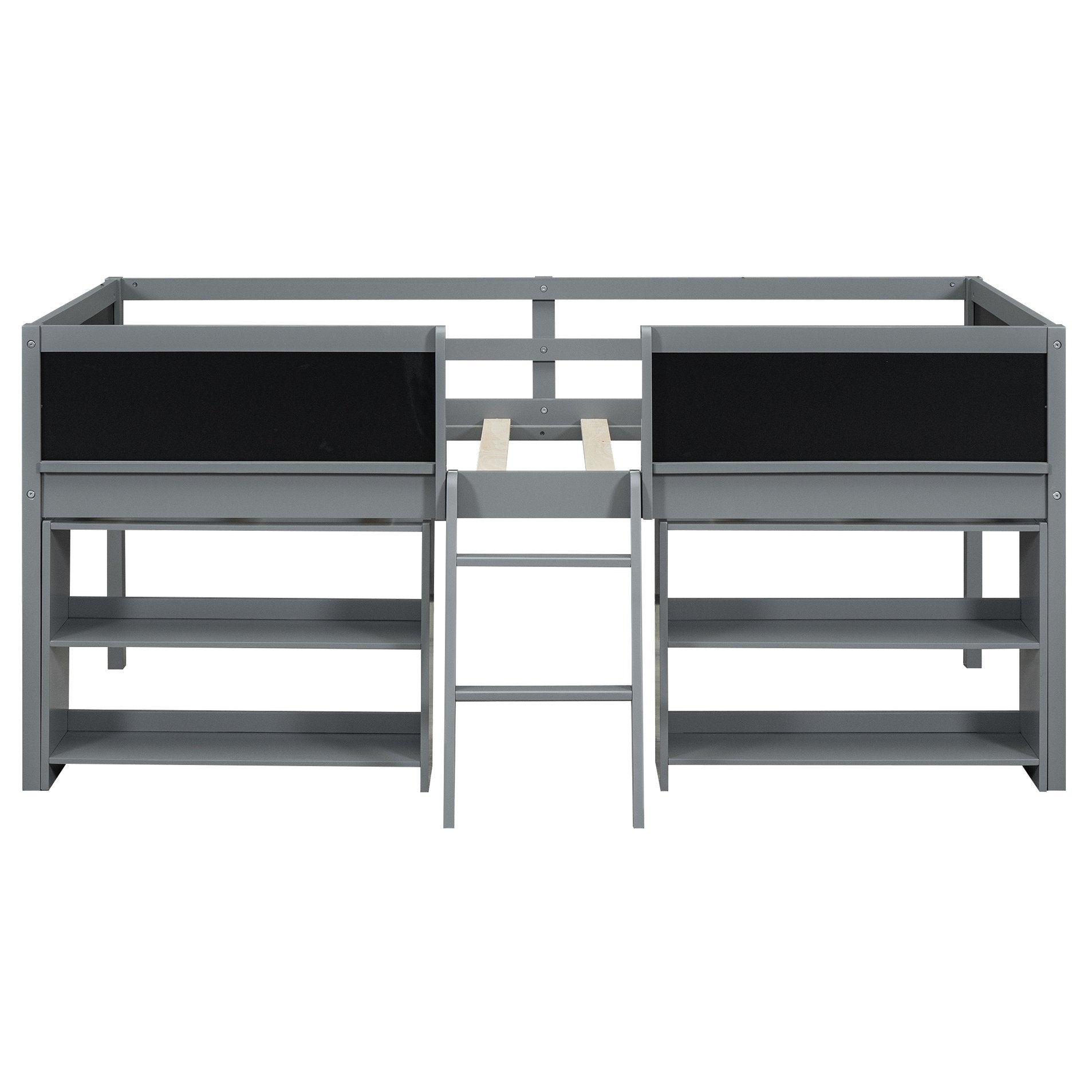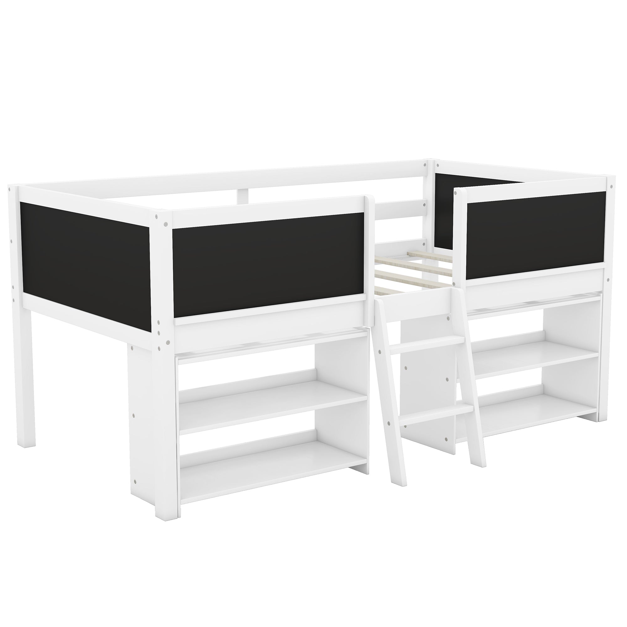 Bring playful, practical design to a child's bedroom with this Twin-size low loft bed. Crafted from solid pine and MDF, the house-style frame combines sturdy construction with smart storage: built-in stairs flanked by two movable shelves, a decorative guardrail with chalkboard surface for creative play, and a low loft profile that keeps the bed accessible while freeing up floor space underneath.