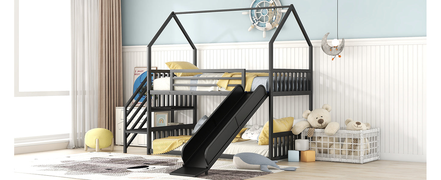 Bring playtime and sleep together with this modern twin house-style bunk bed in sleek black. Crafted from sturdy metal and MDF, it maximizes floor space with two twin sleeping areas while adding fun and function with an integrated slide and staircase. Ideal for siblings, shared rooms, or sleepovers, the design balances safety, durability, and child-friendly features to create a cozy, adventurous bedroom centerpiece.