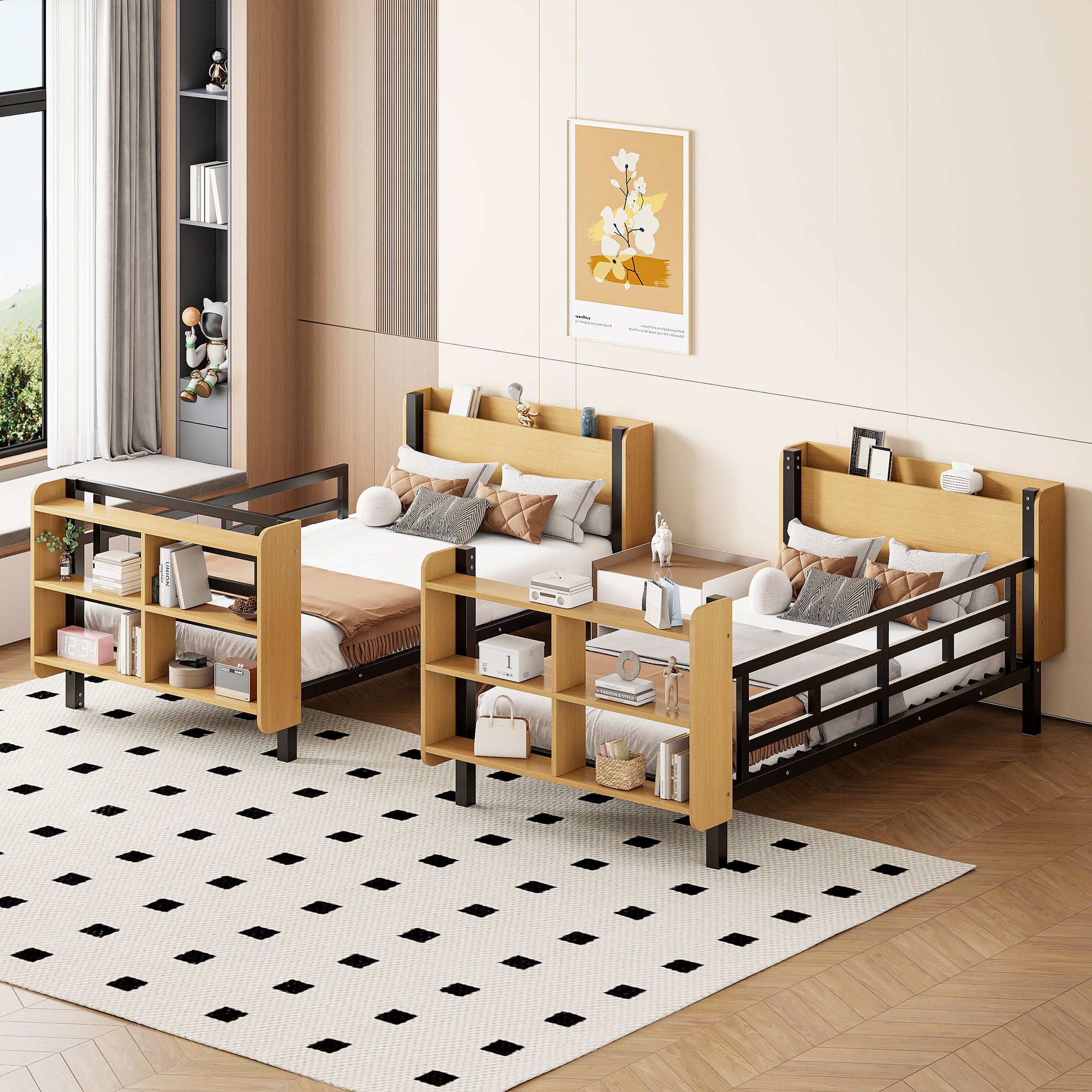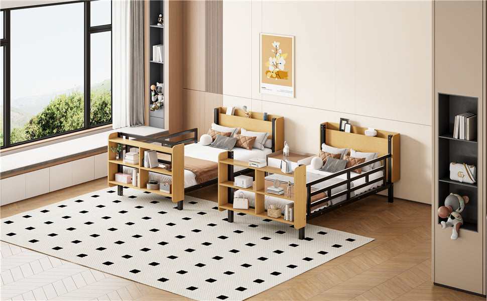 - Integrated storage: Unique headboard shelf for alarm clocks or decor and a four-grid shelving unit at the footboard for books and daily essentials.