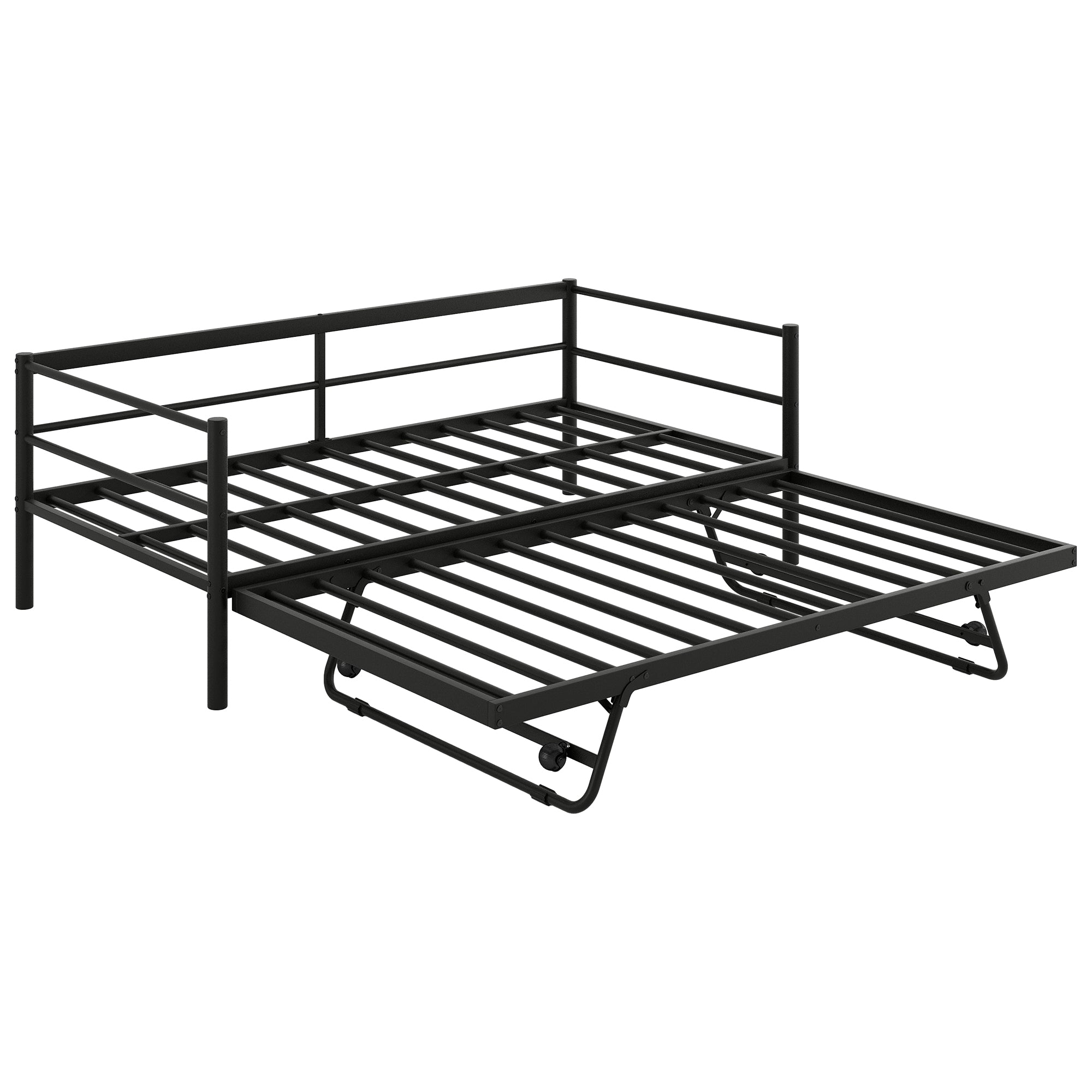 Add industrial flair and practical function to any bedroom with this Twin metal daybed featuring built-in LED lighting and an adjustable pop-up trundle. Combining heavy-duty steel construction with smooth curved piping and a modern black finish, this versatile piece works as a stylish single bed, guest bed for sleepovers, or space-saving duo when the trundle is raised. Easy-to-assemble and rated for everyday use, it delivers solid support and a clean, contemporary focal point.