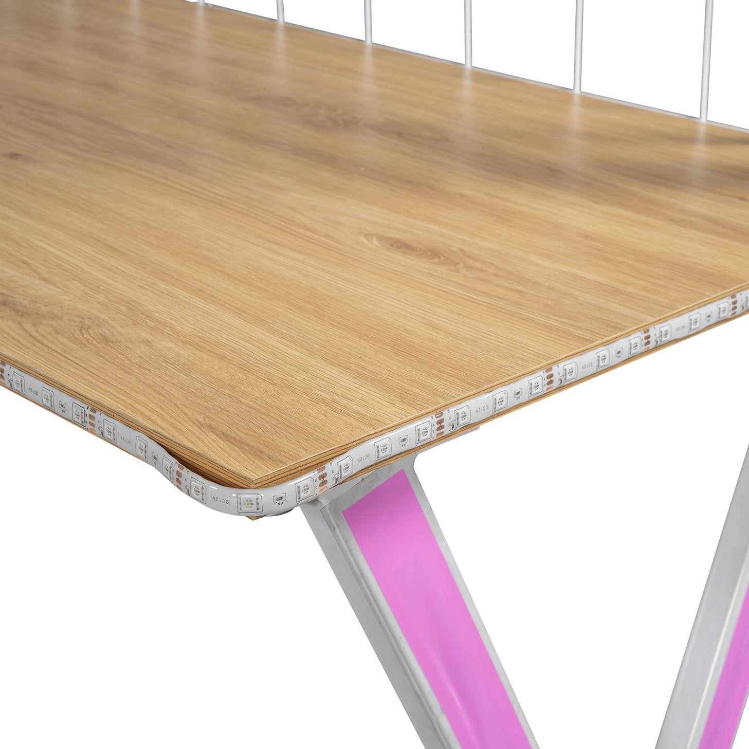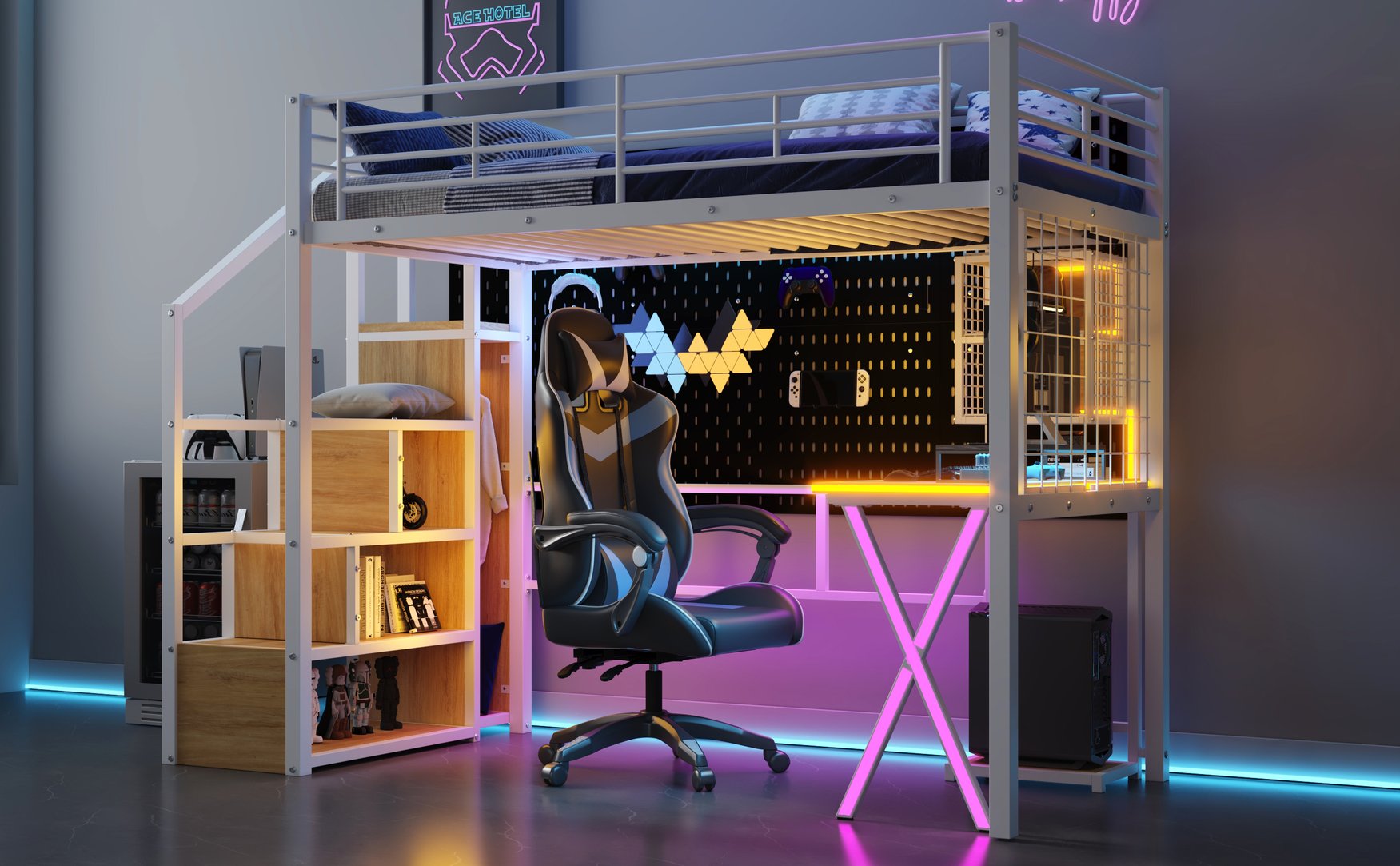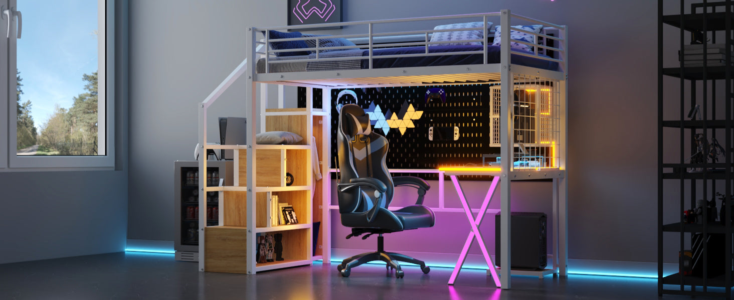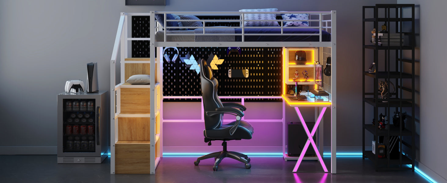 - [LED Workstation] This loft bed includes a built-in desk, 2 storage shelves and 1 computer host shelf and 2 grid boards. With the LED light strips on the X-shaped table legs and the edges of desks and shelves, you can turn the underspace into a clever workstation, a reading nook or a craft area.