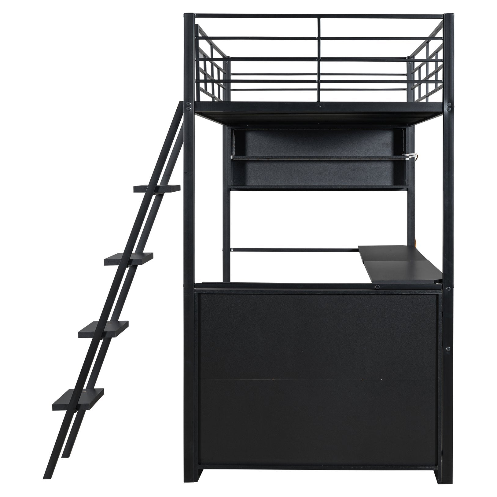 Transform your bedroom into a smart, space-saving sanctuary with this modern twin loft bed. Designed for functionality and style, it combines a sturdy metal-and-MDF frame with integrated LED lighting, a built-in desk, ladder access, and four storage shelves—ideal for students, small apartments, or guest rooms. Clean lines and a matte black finish make it easy to match existing decor while maximizing floor space for study, storage, or seating beneath the loft.
