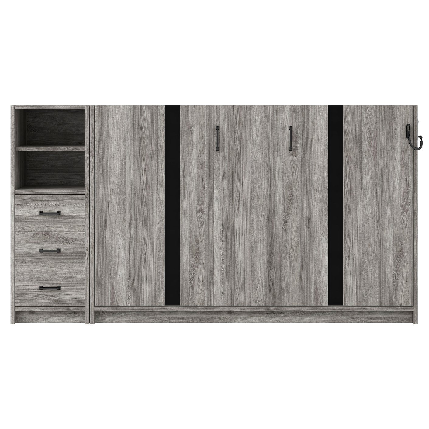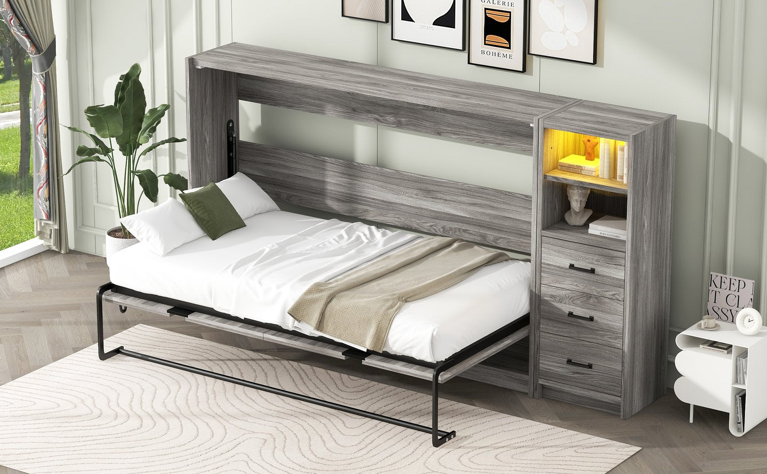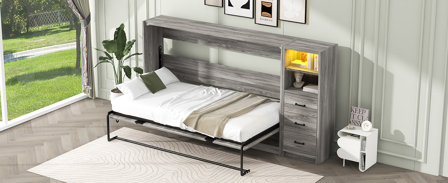 Maximize your space without sacrificing style—this twin Murphy bed converts from a sleek gray cabinet to a comfortable sleeping surface in seconds, making it ideal for guest rooms, home offices, studio apartments, or any multi-use room. Built with solid pine and MDF, reinforced metal hardware, and integrated LED lighting, the design blends durability with modern convenience. Smooth folding action and ample storage drawers keep your space tidy while providing a sturdy, supportive bed for overnight guests.