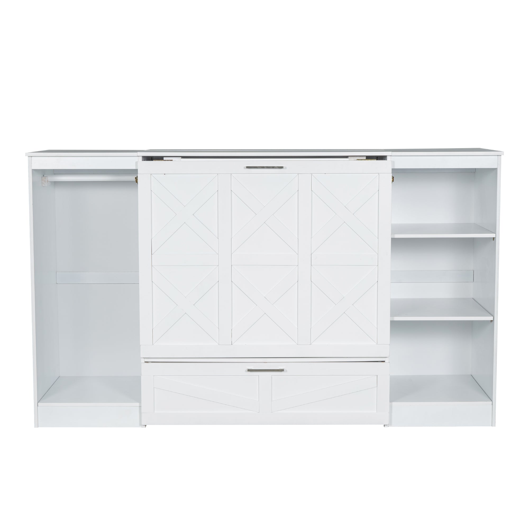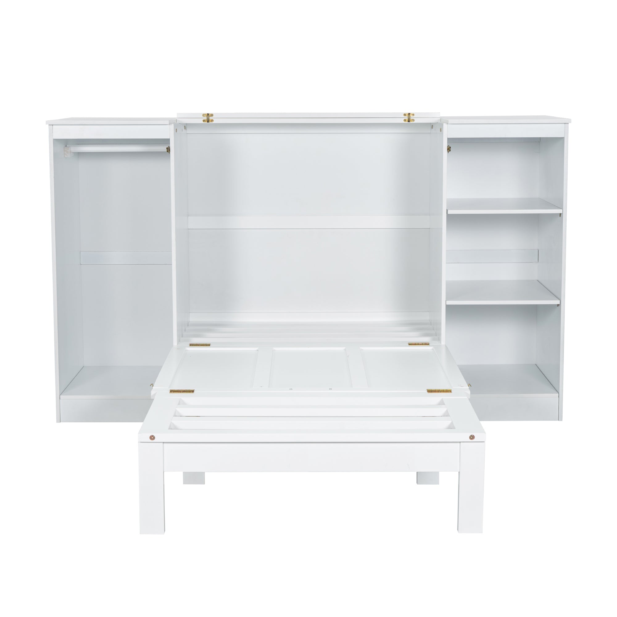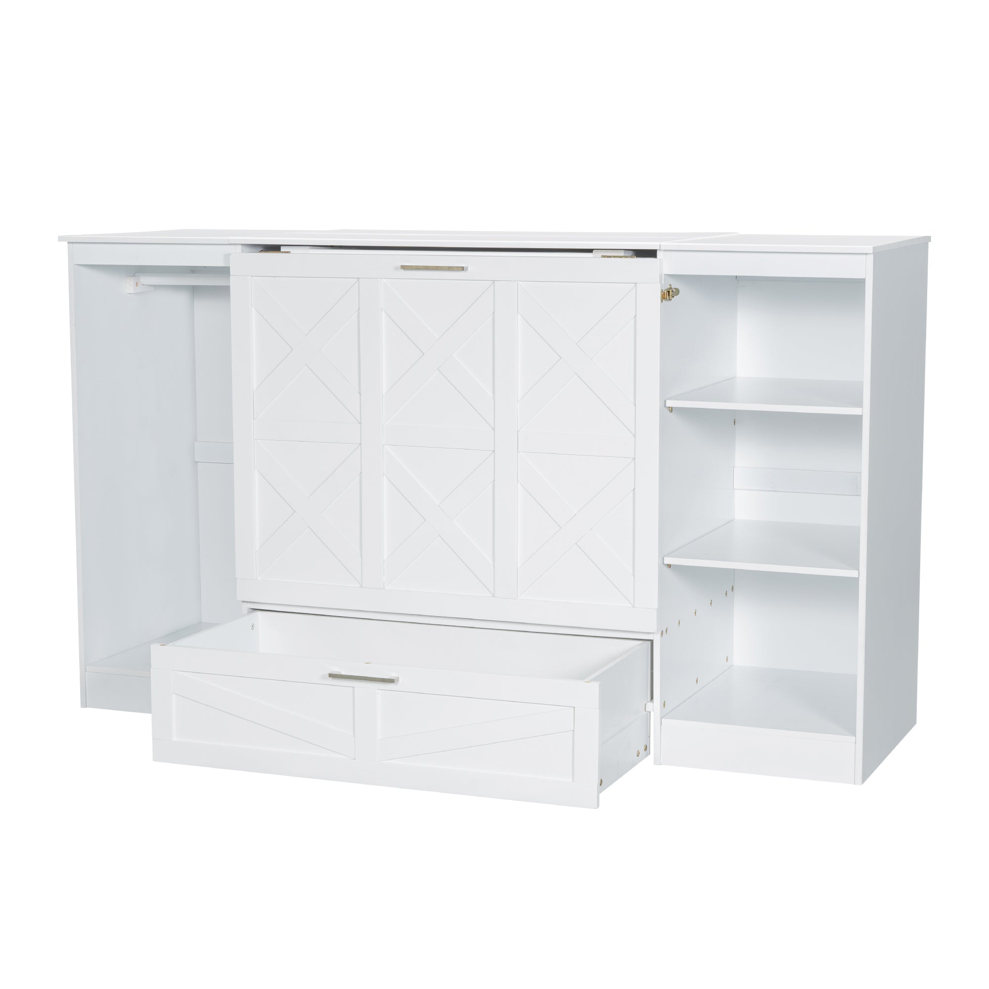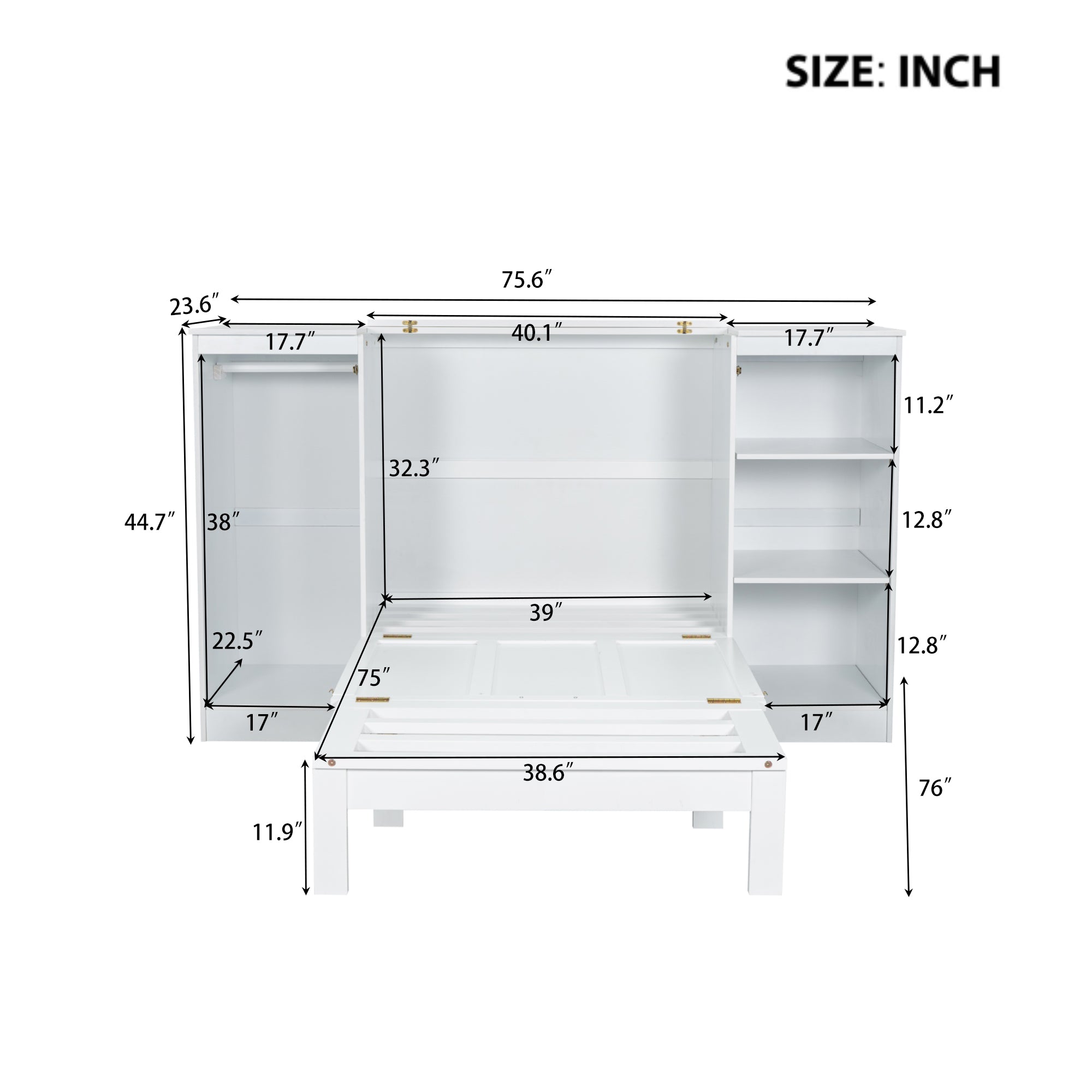Make the most of small spaces without sacrificing style or function. This white twin-size Murphy bed converts instantly from a tidy storage cabinet into a comfortable guest bed, combining bedside shelving and a built-in wardrobe to keep linens, books, and clothing organized. Crafted from pine wood and MDF, it delivers a clean, modern look with durable construction—ideal for studio apartments, home offices, or multipurpose rooms.