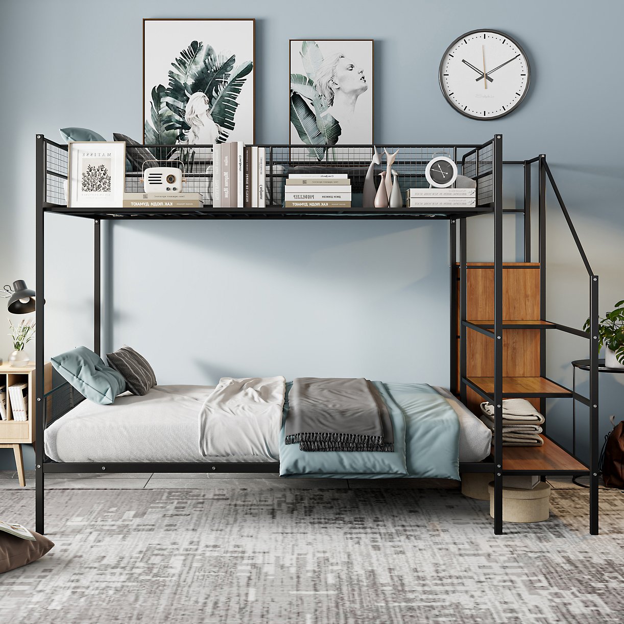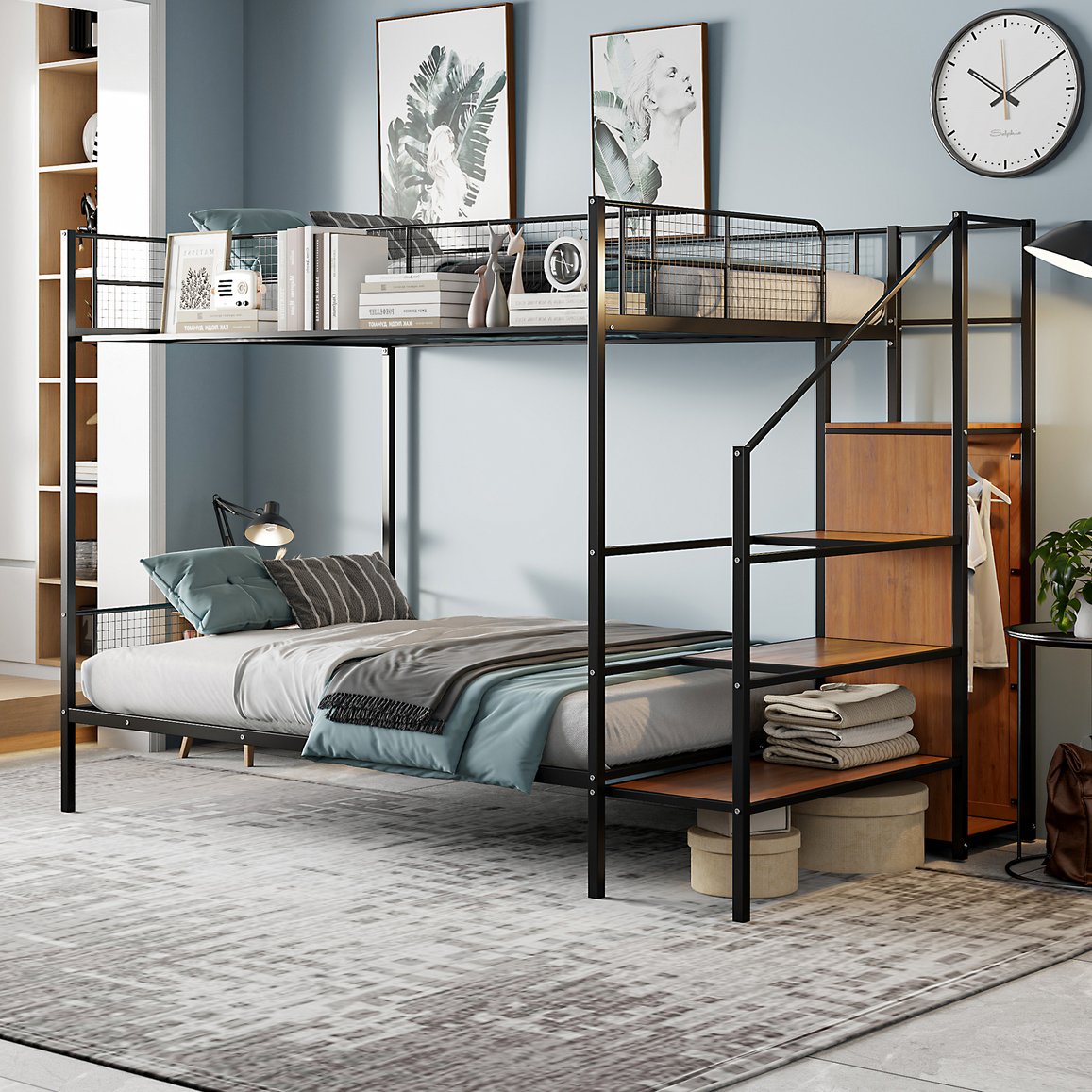 - Wire shelving: Top-bunk wire shelves offer secure, ventilated storage for essentials and are integrated into the guardrail area for convenience.