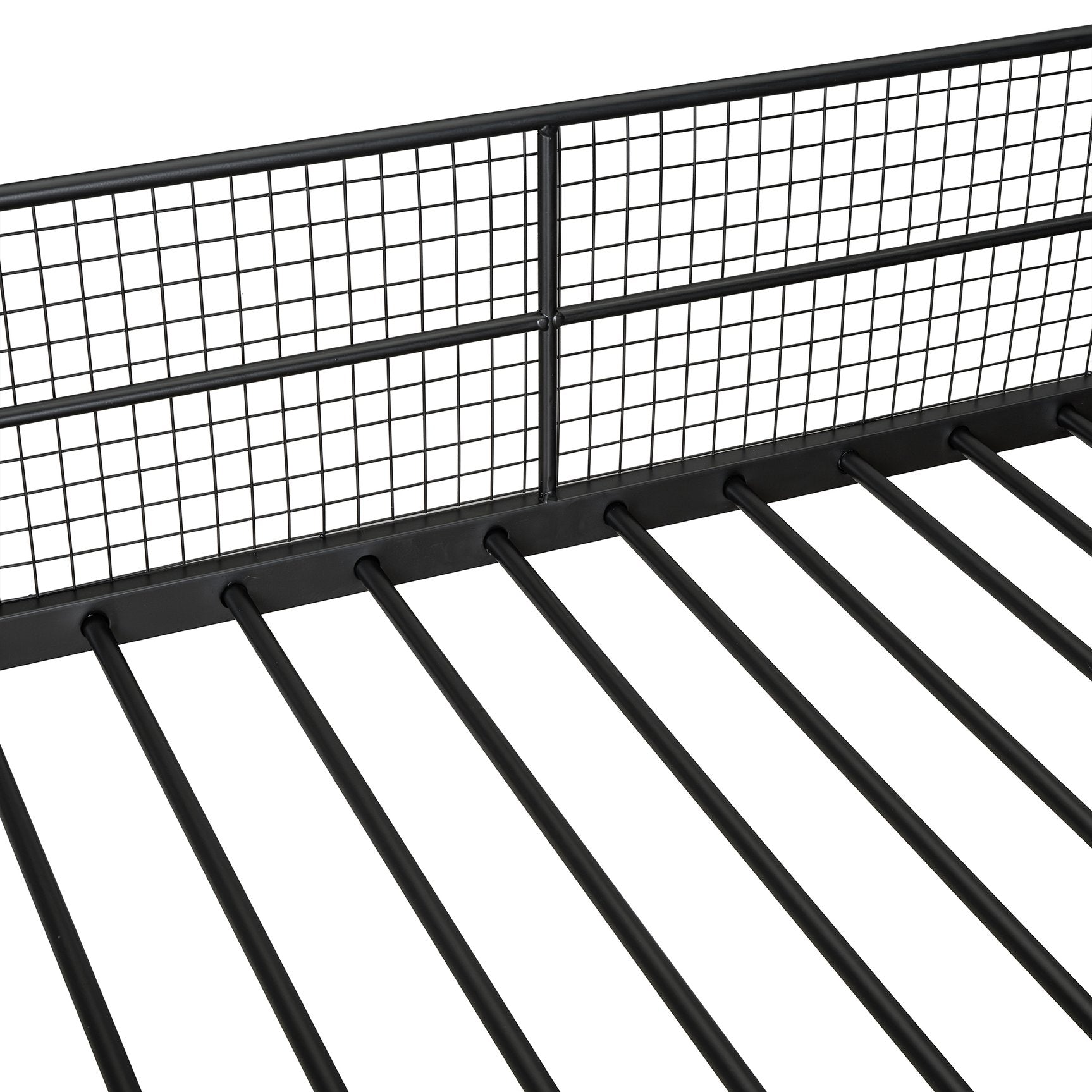 - [Top Bunk with Wire Shelving] The top single bed comes with a wire shelving unit, providing extra storage space for small items, books, or decorative pieces, making the bedroom more organized.