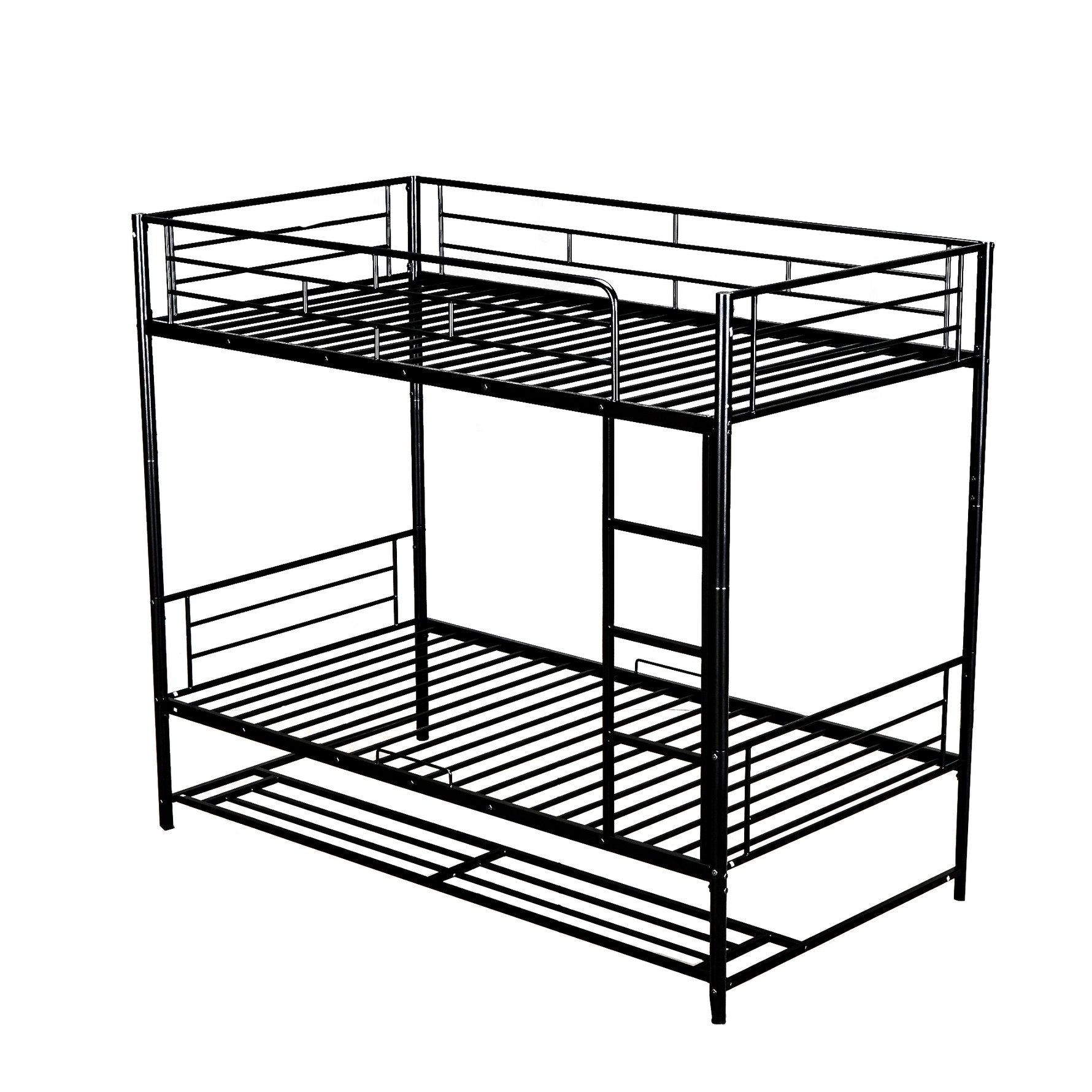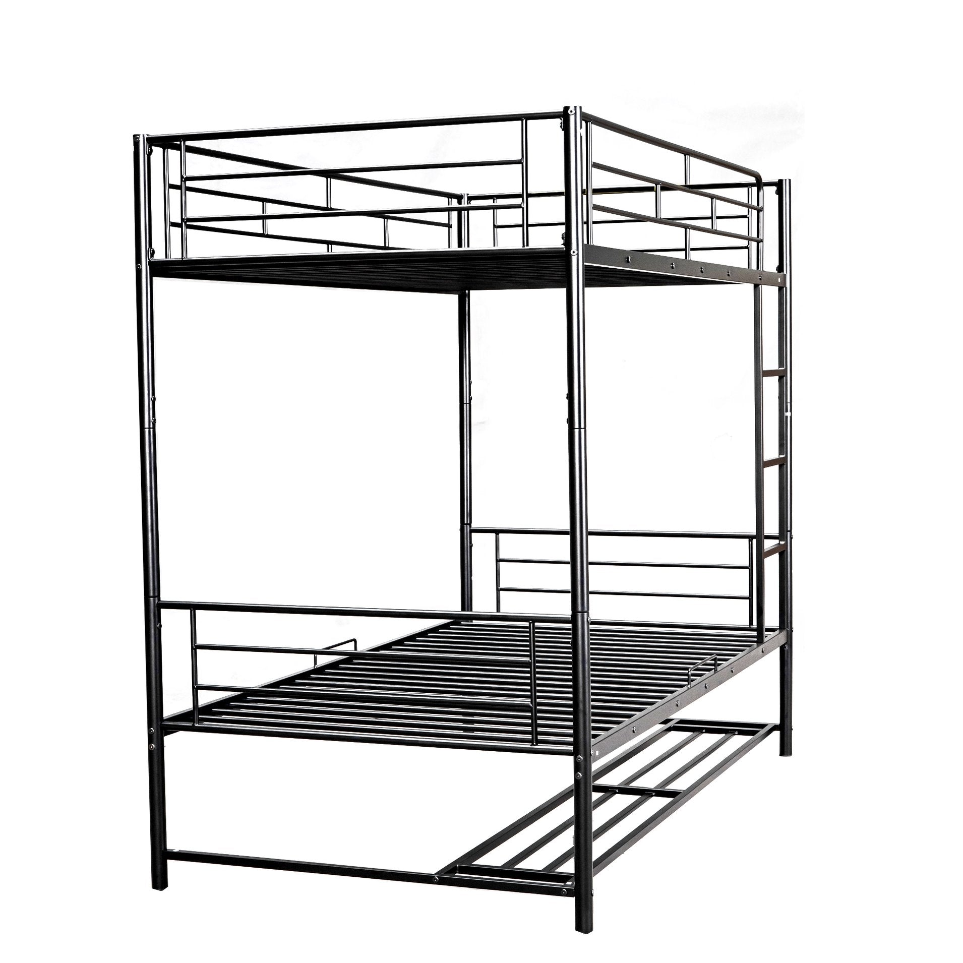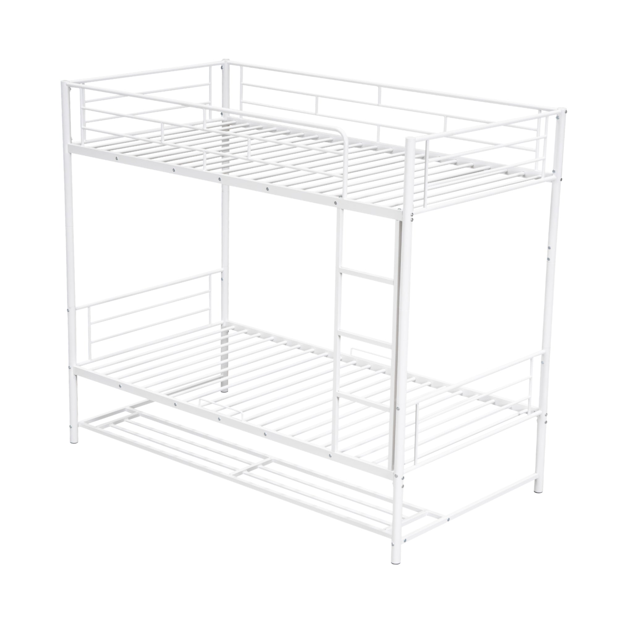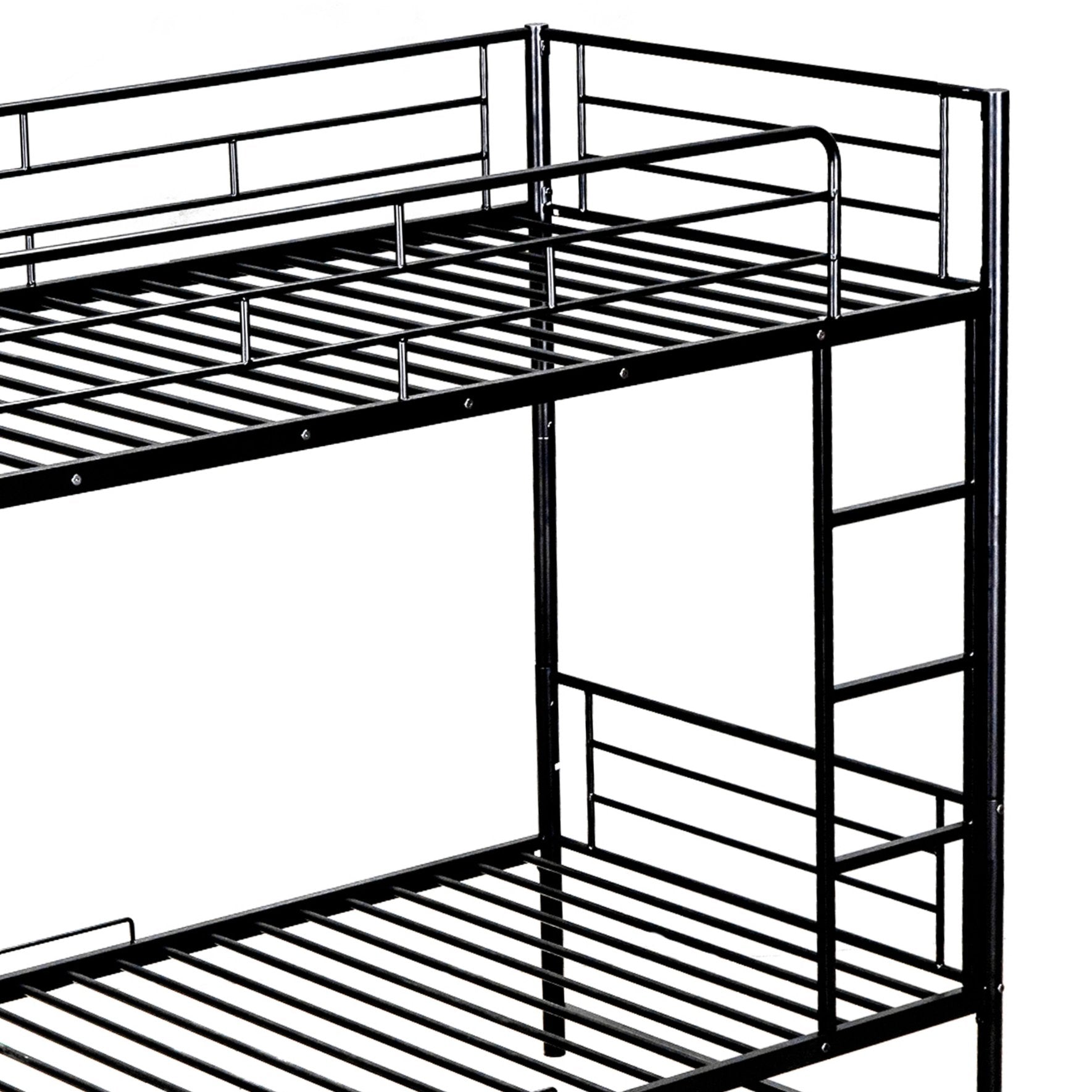This sleek twin-over-twin metal bunk bed combines durable steel construction with a space-saving, versatile design ideal for shared bedrooms, guest rooms, or dorms. Safety-focused features—like full-length guardrails and an integrated ladder—make it practical for everyday use, while the built-in lower shelf adds useful storage without taking extra floor space. The bed can also separate into two standalone twin beds to adapt as your needs change.