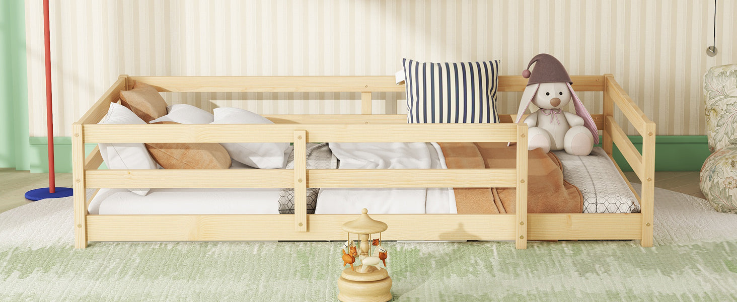 Give your child a safe, cozy, and stylish place to sleep with this natural pine Montessori-style floor bed. Designed for independence and low-to-the-ground comfort, the simple, durable construction blends with any nursery or bedroom decor while providing a secure sleeping environment for toddlers and young children. Easy to assemble and maintain, this bed encourages mobility and confidence while keeping safety and practicality front and center.