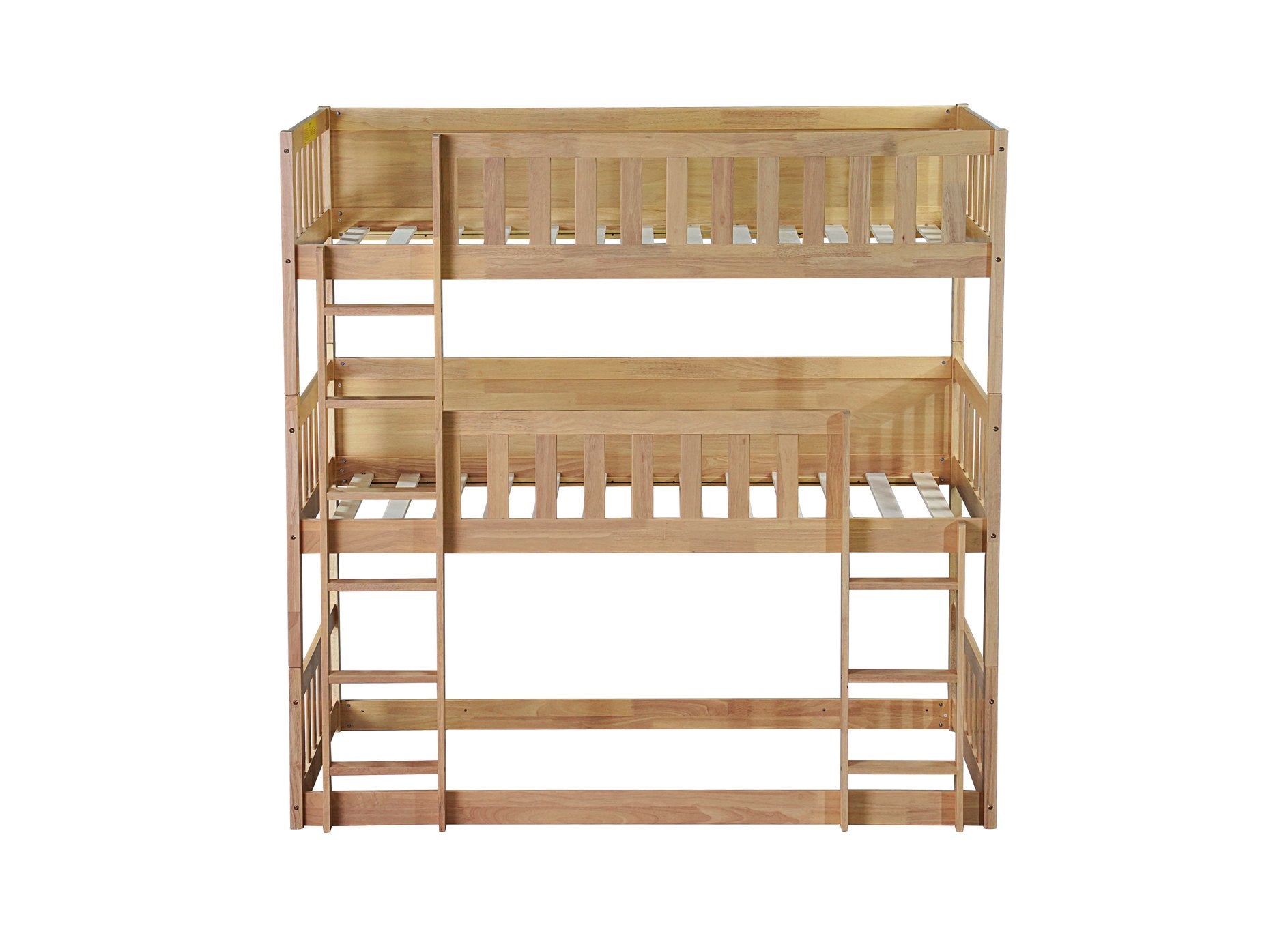 - [Safety and Quality Guaranteed]This bunk bed is mainly crafted from high-quality solid rubber wood and composite wood, providing lasting sturdiness and durability. The two built-in ladders are constructed with firmly secured steps, forging solid stability that ensures the safety while climbing up and down the ladders. The triple bunk features full-length guardrails on the upper and middle bunks which prevent accidental falls.