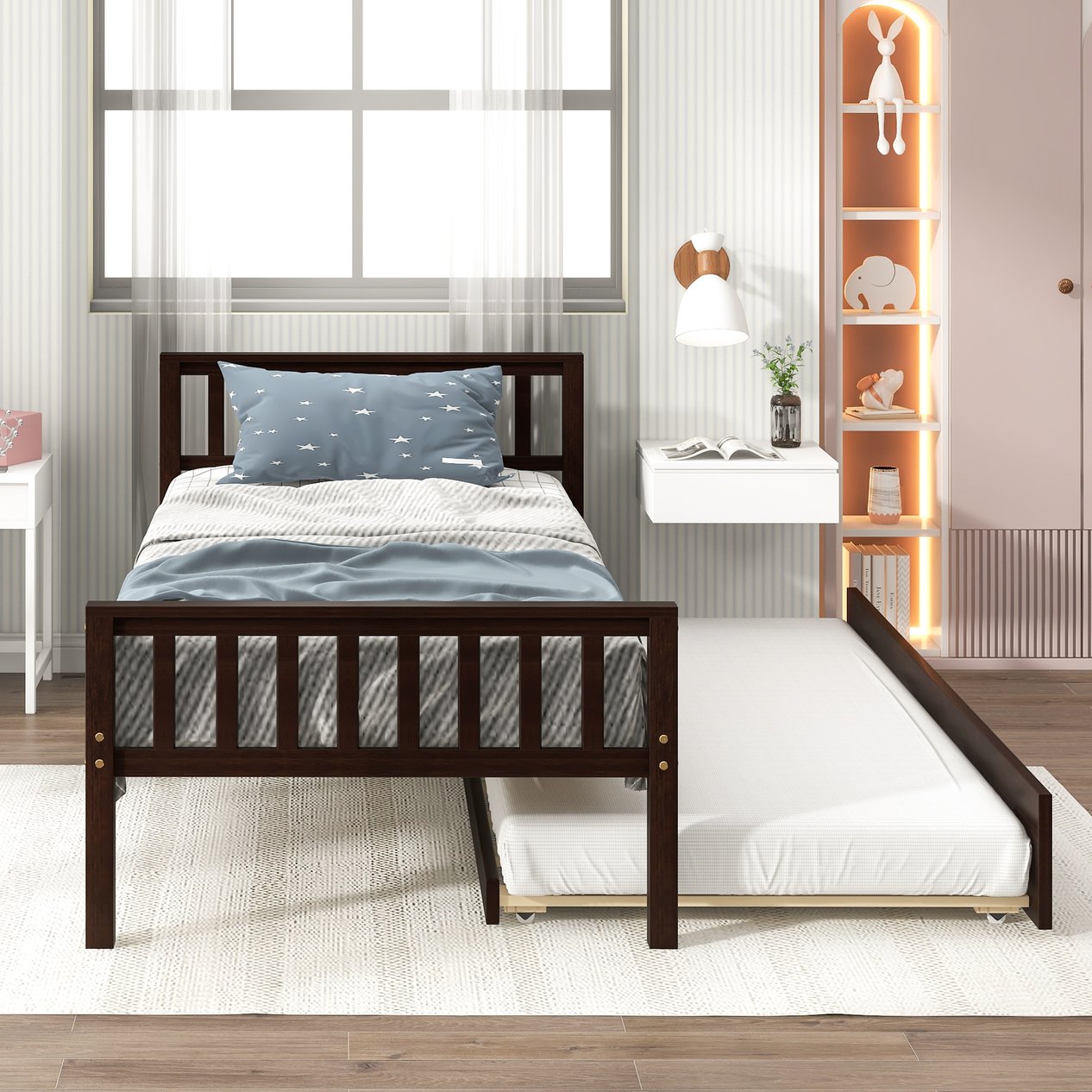 This twin bed with trundle blends clean, modern lines and practical functionality to maximize sleeping space in small bedrooms, guest rooms, or apartments. The integrated trundle provides an extra sleep surface without taking up permanent floor space, while the sturdy platform design eliminates the need for a box spring. Finished in a versatile espresso, the bed offers a refined look that suits many decor styles and delivers dependable nightly comfort.