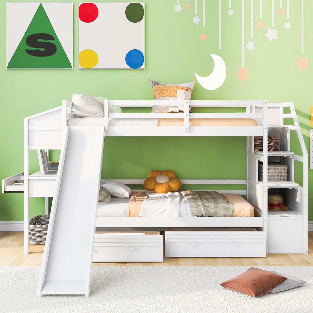 Create a fun, space-saving bedroom centerpiece that blends play, storage, and study into one sturdy unit. This twin-over-twin bunk system features a safe staircase with built-in drawers, a slide for play, and an integrated desk with shelving and additional drawers—ideal for siblings sharing a room or for a single child who needs sleep, study, and storage all in one neat, modern design.