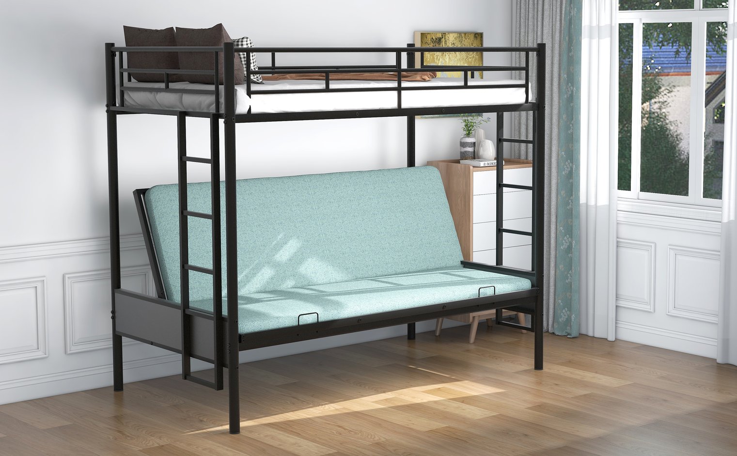 - 【Sleek Metal Bunk Bed】This metal bunk bed seamlessly combines a futon sofa with a twin over full configuration, making it a versatile Multi-Function bunk bed. The sleek, space-saving design adds modern elegance to any bedroom, while the powder-coated metal frame ensures a stylish, durable centerpiece.