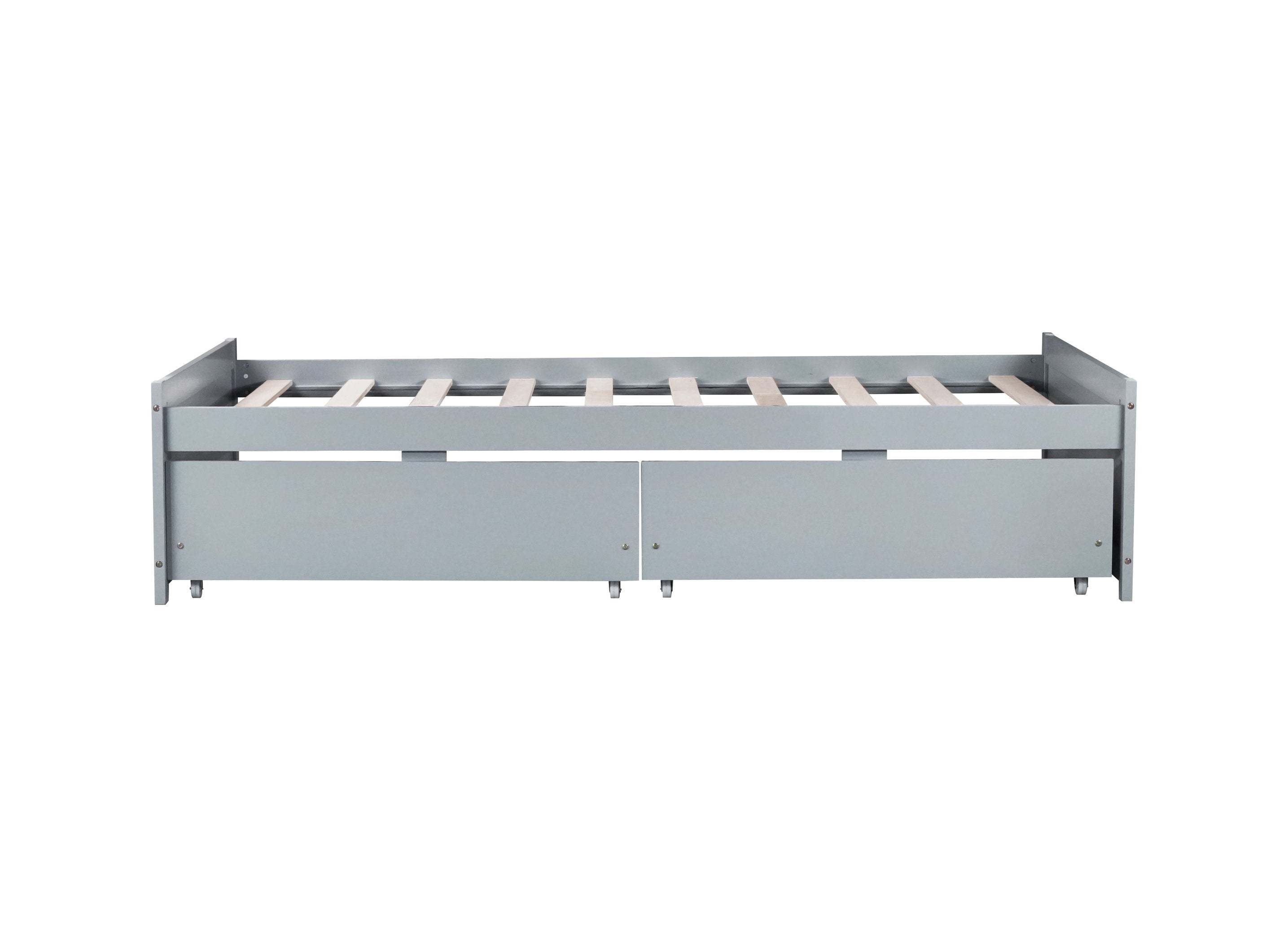 Enjoy a compact, stylish solution for small bedrooms or guest rooms with this solid rubberwood twin bed. Thoughtfully designed for durability and everyday use, it pairs natural wood character with practical storage—two smooth pull-out drawers—so you can keep linens, clothes, or toys neatly organized without sacrificing floor space. Its neutral grey finish complements a variety of décors and the low-profile design works well for kids’ rooms, apartments, or minimalist interiors.