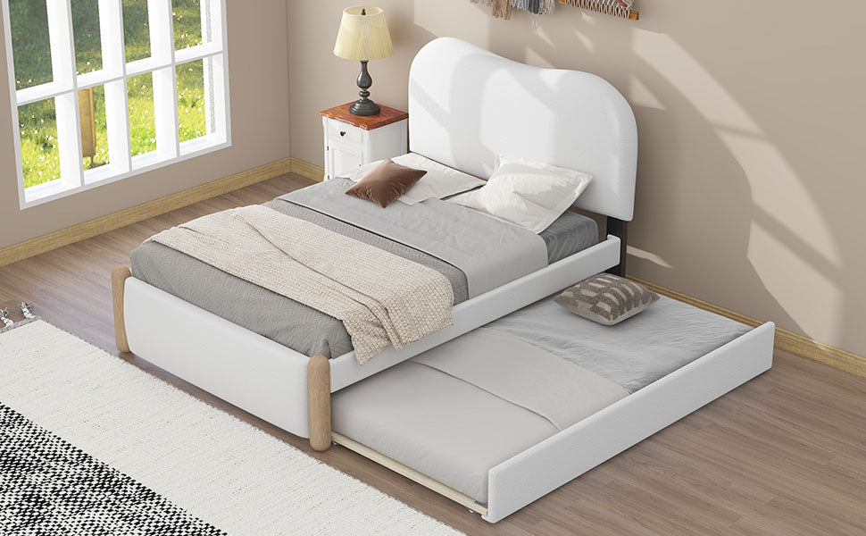 Bring style and practical sleep solutions to a compact bedroom with this upholstered twin platform bed featuring an arched headboard and a convenient pull-out twin trundle. The soft gray Berber fleece upholstery and wood supporting feet create a cozy, contemporary look while the sturdy pine/MDF frame and thoughtful slat system provide reliable support for everyday use and overnight guests.